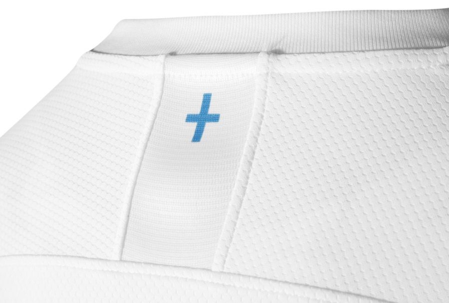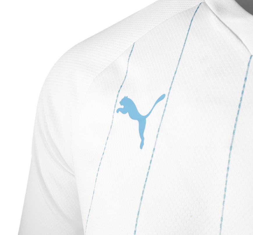 Notons que les lignes verticales sont composées d’un lettrage « OLYMPIQUE DE MARSEILLE » et qu’une croix bleue a été apposée à l’arrière du cou en hommage à la ville et à son identité. Le logo Puma est lui présent en bleu sur la poitrine et sur les épaules. Le kit domicile sera accompagné d’un short blanc aux liserés bleus et de chaussettes blanches.