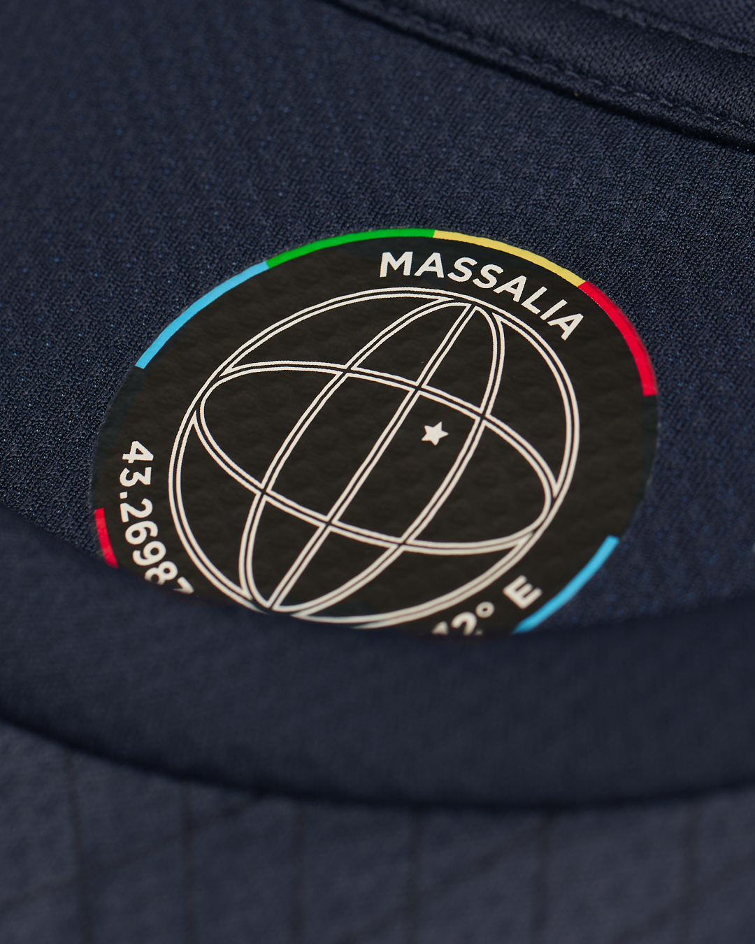 A l’intérieur du col, une mappemonde est présente avec Marseille symbolisée par une étoile. On retrouve également les coordonnées GPS de l’Orange Vélodrome (43.2965° N, 5.3698° E) ainsi que le nom grec d’origine de la ville : Massalia.