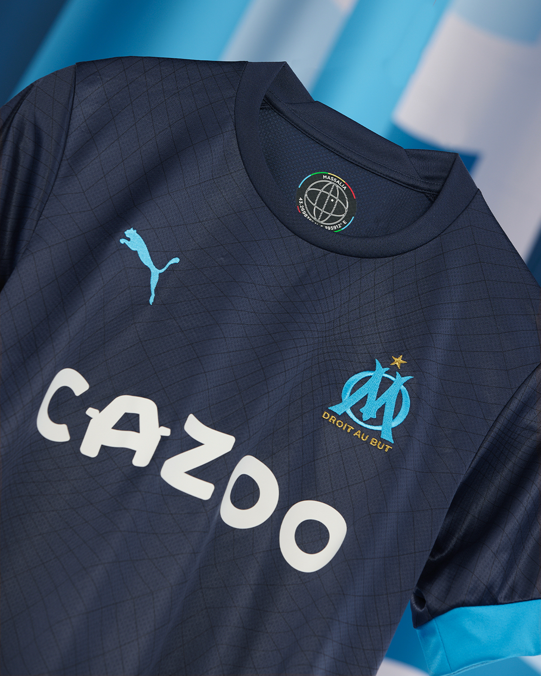 Pour ce maillot extérieur à dominante bleu marine et arborant le logo de l’Olympique de Marseille et de Puma en bleu azur (ainsi que l’extrémité des manches), le club phocéen et l’équipementier ont décidé de relever son design avec des lignes représentant les latitudes et les longitudes du monde.