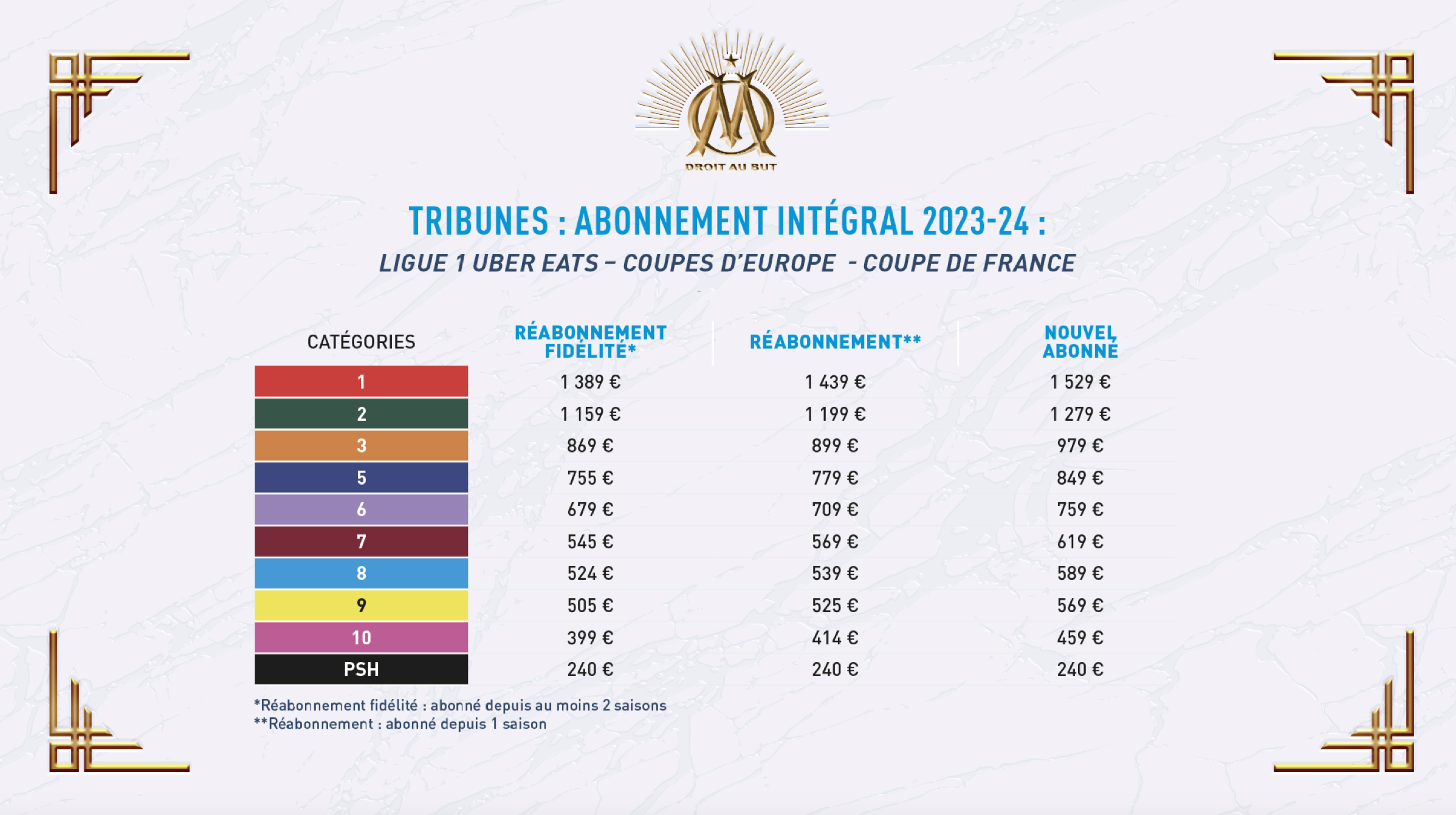 Sur ce point-là d’ailleurs, Marseille propose cette saison un « abonnement intégral » qui comme son nom l’indique, englobe l’intégralité des matchs du club dans son stade. « L’abonnement intégral comprend vraiment tous les matchs joués à domicile par l’Olympique de Marseille sur la saison 2023/24, même ceux qui n’existent pas encore. Championnat, Coupes d’Europe, Coupe de France… »