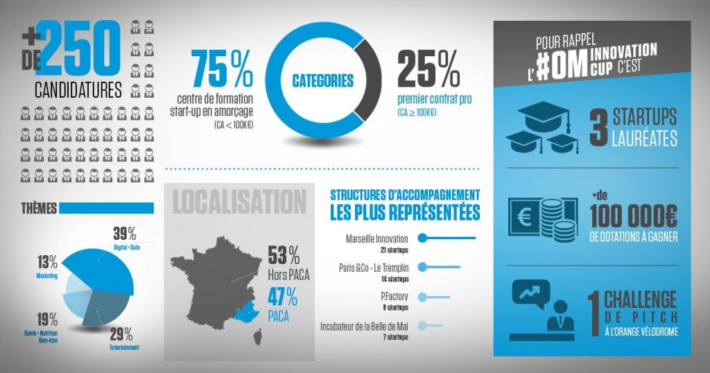 Les startups retenues pitcheront le 10 décembre à l’Orange Vélodrome en amont du match OM -ASSE. La startup gagnante toutes catégories confondues empochera un chèque de 50 000€. 25 000€ seront remis à la startup gagnante en amorçage (CA < 100 000€) et « 1er contrat pro » (CA ≥ 100 000€).