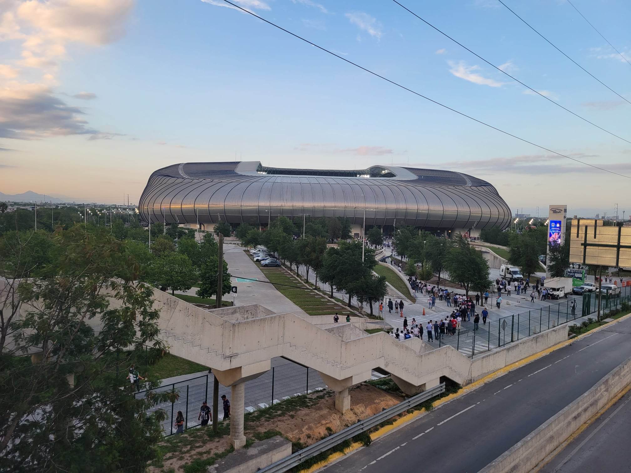 18 heures, le coup d’envoi est dans une heure, on monte dans un Uber en direction du stade. Il se trouve dans le quartier de Guadalupe, au sud-est de l’immense agglomération de Monterrey (3 millions d’habitants quand même). Notre chauffeur nous laisse, un peu à l’arrache, sur le bord du périph’. Folklorique. On traverse cet axe à six voies sur un pont qui nous offre un premier aperçu de l’Estadio BBVA Bancomer.