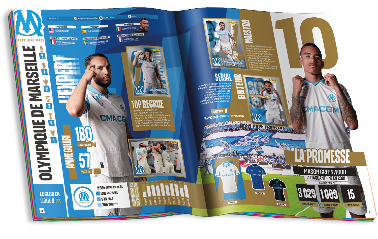 Chaque club de Ligue 1 McDonald’s bénéficie d’un traitement XXL, avec quatre pages et 28 stickers par équipe. La répartition est millimétrée : joueurs clés, recrues, profils offensifs, écussons, maillots et scènes d’action. Les têtes d’affiche du championnat sont bien présentes, de Pogba à Giroud, en passant par Dembélé, Vitinha, Aubameyang ou encore Doué.