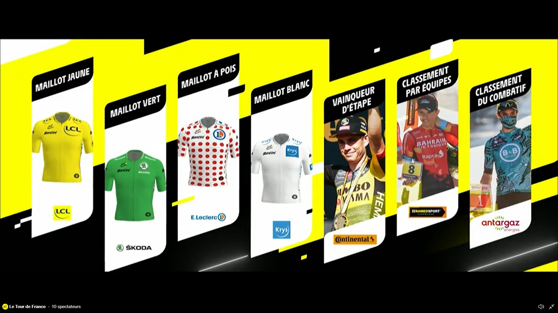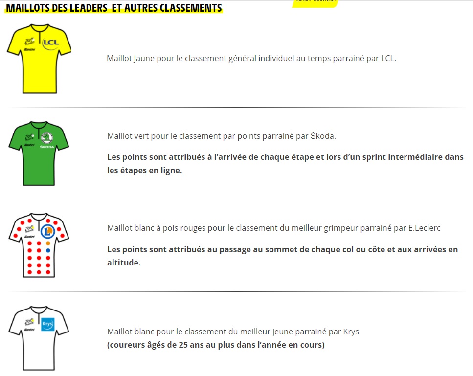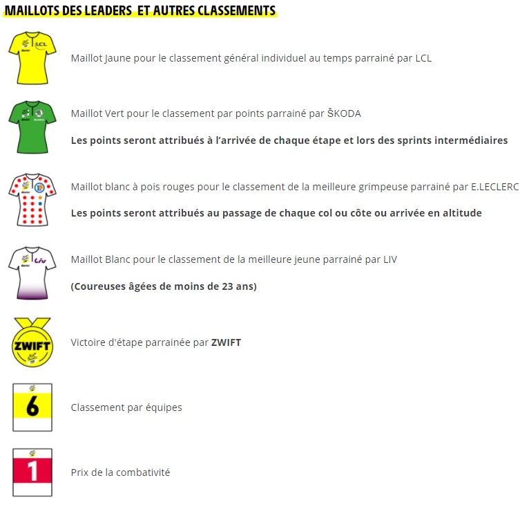 Les maillots, désormais fournis par Santini en remplacement du Coq Sportif, seront sponsorisés par LCL (maillot jaune), Skoda (maillot vert), E.Leclerc (maillot à pois) et Liv (maillot blanc). La victoire d’étape sera elle parrainée par Zwift qui est également partenaire-titre du Tour. Notons que le classement par équipes et le prix de la combativité n’ont pas encore de sponsors.