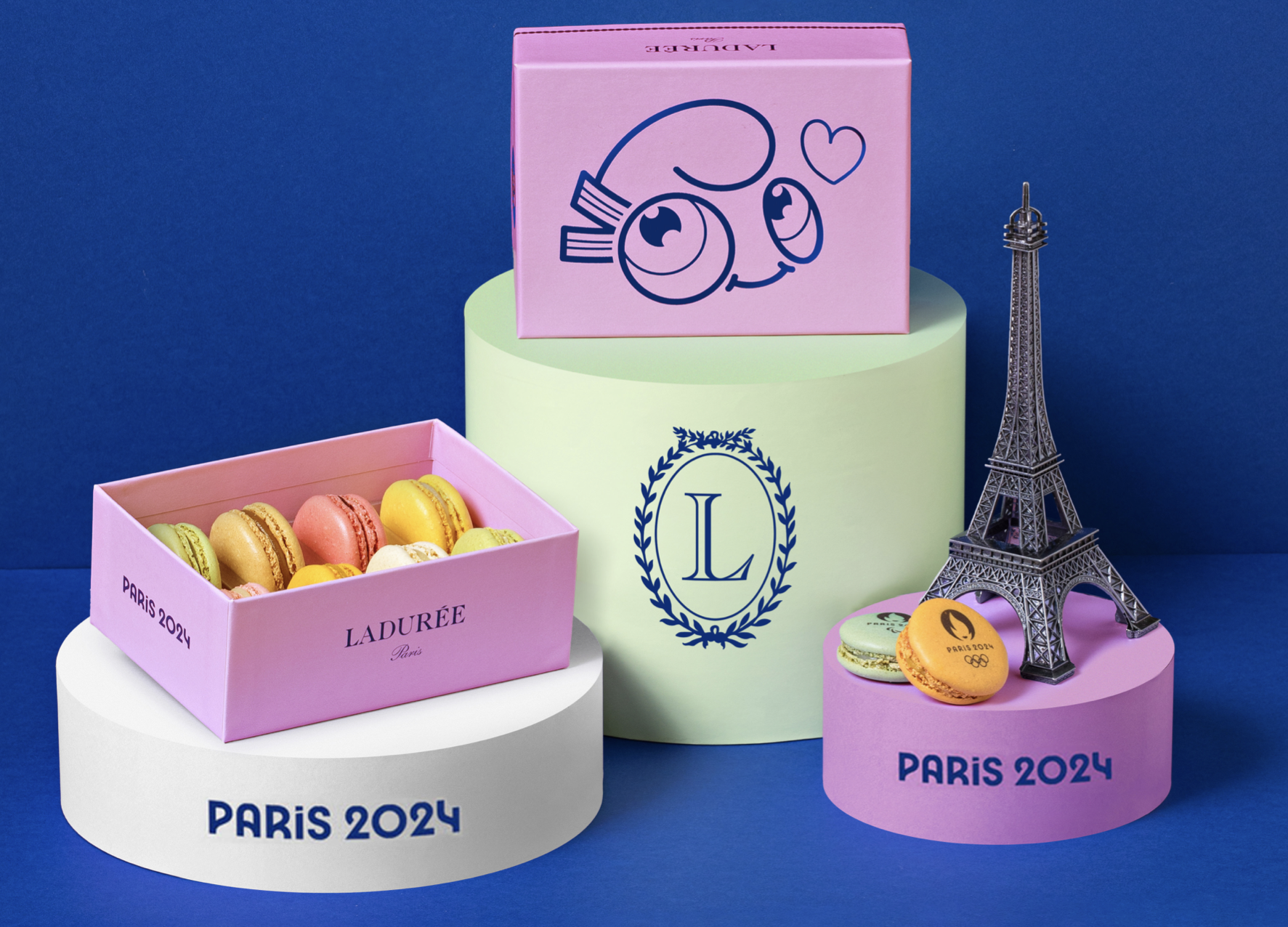 Depuis le 17 avril, Ladurée commercialise des macarons dans des boîtes Paris 2024, mais sans les logos des JO sur les mignardises. Des tartes aux mêmes goûts seront vendues 12€ (15€ sur place) à partir du 19 juin pour la saveur « Olympique » et du 17 juillet pour la « Paralympique », jusqu’au 3 septembre.