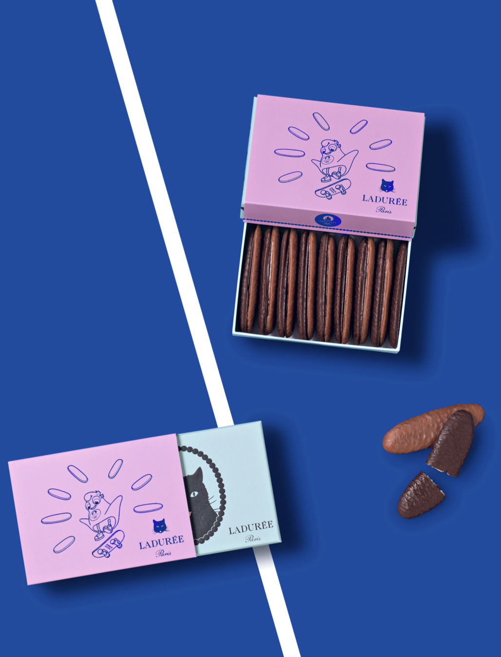 Ladurée va aussi vendre le « coffret 18 Eugénie avec fourreau » pour 49€ (biscuits enrobés de chocolat) et le coffret de 8 langues de chat pour 20€. Des phryges faisant du skate seront visibles sur le packaging de ces deux derniers coffrets.