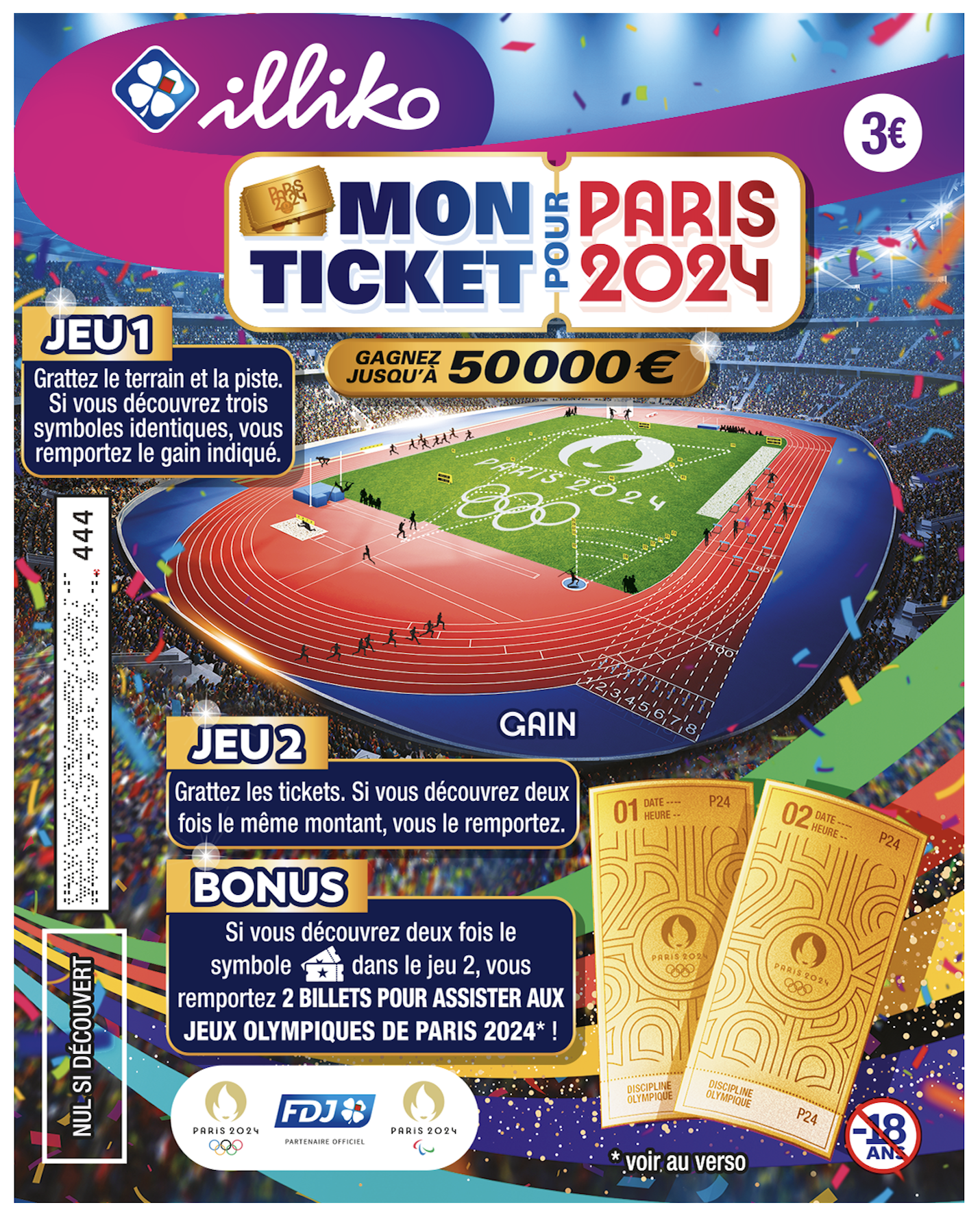 Vendu 3€ dans plus de 30 000 points de vente en France, le jeu est également disponible en version digitale. Sur le ticket, 3 jeux différents apparaissent avec la possibilité de gagner jusqu’à 50 000€. Les joueurs pourront également tenter de gagner des places pour une des épreuves des Jeux Olympiques Paris 2024.