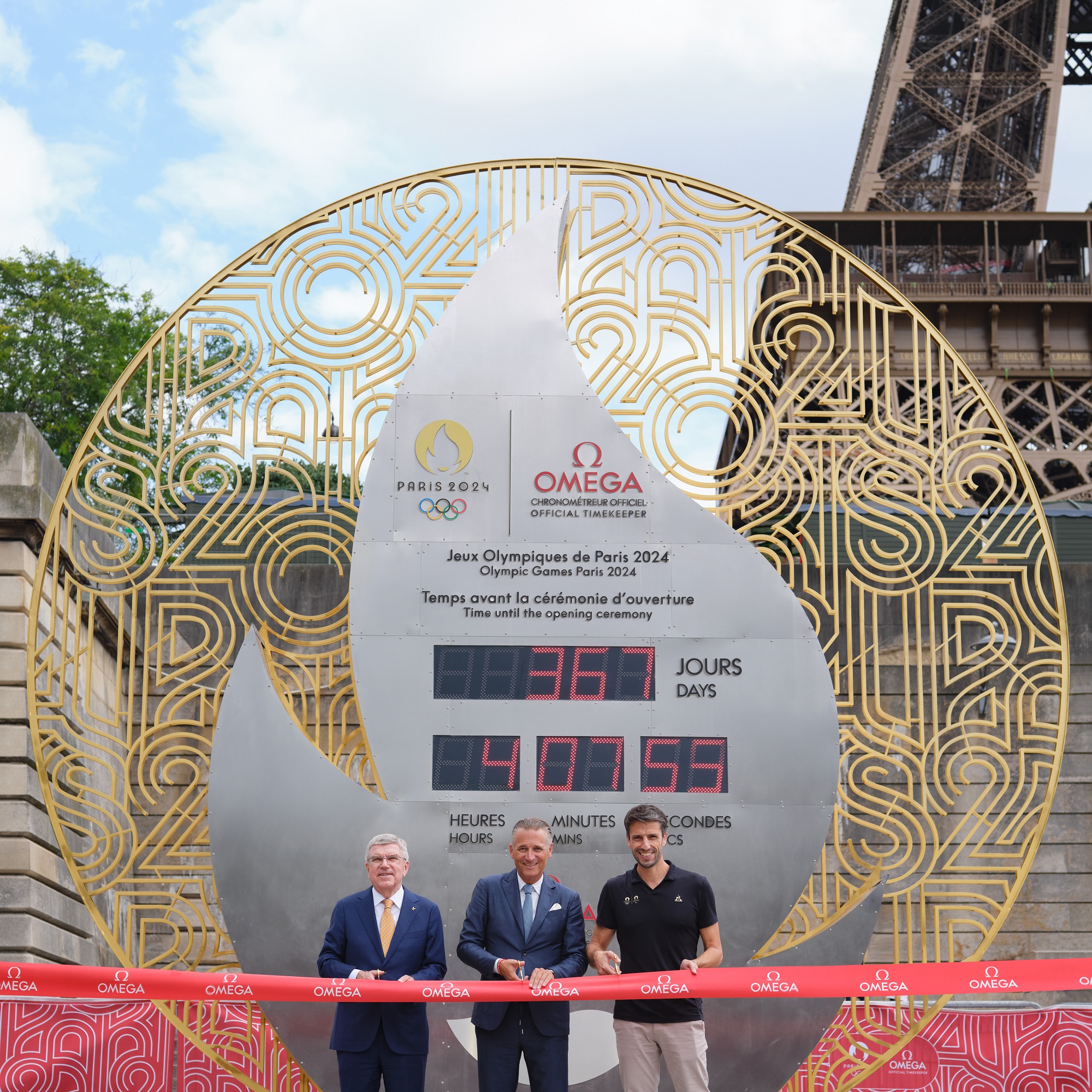 La marque suisse a installé son compte à rebours au au pied de la Tour Eiffel (Port de la Bourdonnais). Un « chronomètre » géant qui sera visible le jour et illuminé la nuit dont le design s’inspire de l’emblème de Paris 2024, avec une flamme centrale entourée d’un cercle doré.