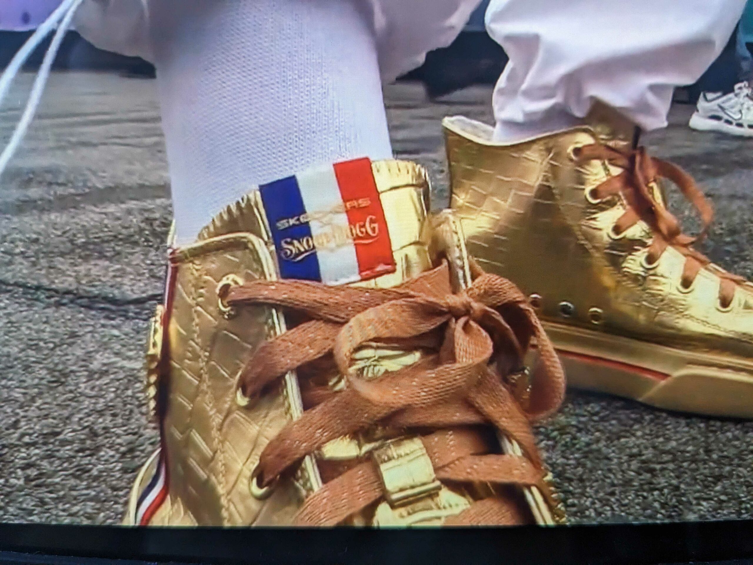 « Ce sont mes chaussures Snoop Dogg, avec Skechers. Je les ai faites sur mesure pour les JO, elle représente votre pays, avec le drapeau français, je voulais montrer à tout le monde que j’aime la France » a précisé Snoop.