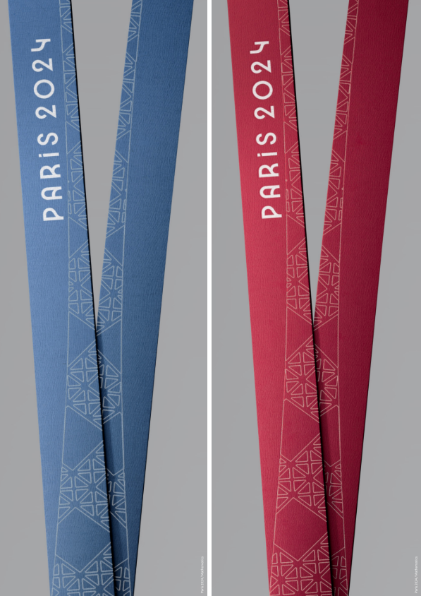 Les médailles olympiques sont accrochées à un ruban bleu fabriqué par la marque Neyret. Un ruban qui sera rouge pour les médailles paralympiques.