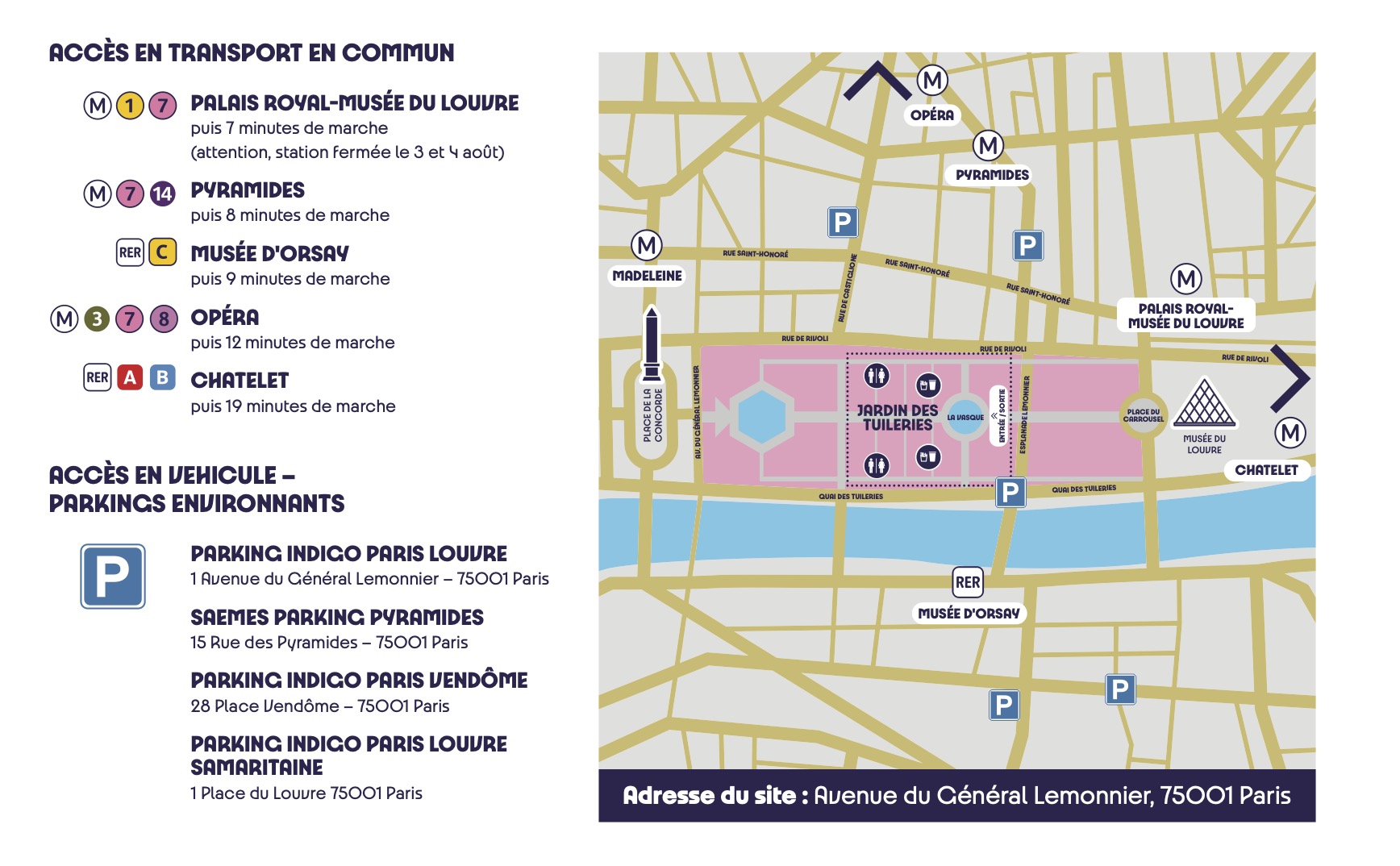 Un lieu qui sera accessible gratuitement pendant la durée des Jeux sur inscription. Chaque jour, 10 000 personnes pourront venir au Jardin des Tuileries de 11h à 19h, avec une jauge fixée à 3 000 personnes présentes simultanément.