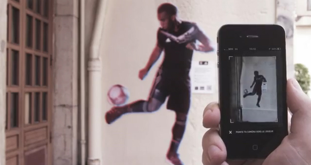 adidas et l’Olympique Lyonnais présentent « OL 3D »: une expérience mêlant football, mobile, street art, et se déroulant du 18 au 30 juillet 2012. Des affiches « street art » des joueurs de l’OL (à taille humaine) ont été dispersées dans la ville de Lyon. Grâce à l’appli mobile « OL 3D », les fans de l’OL peuvent « capturer » les joueurs grâce à une technologie de reconnaissance d’image, puis se lancer dans une série inédite de tirs au but en réalité augmentée mêlant réel et virtuel.