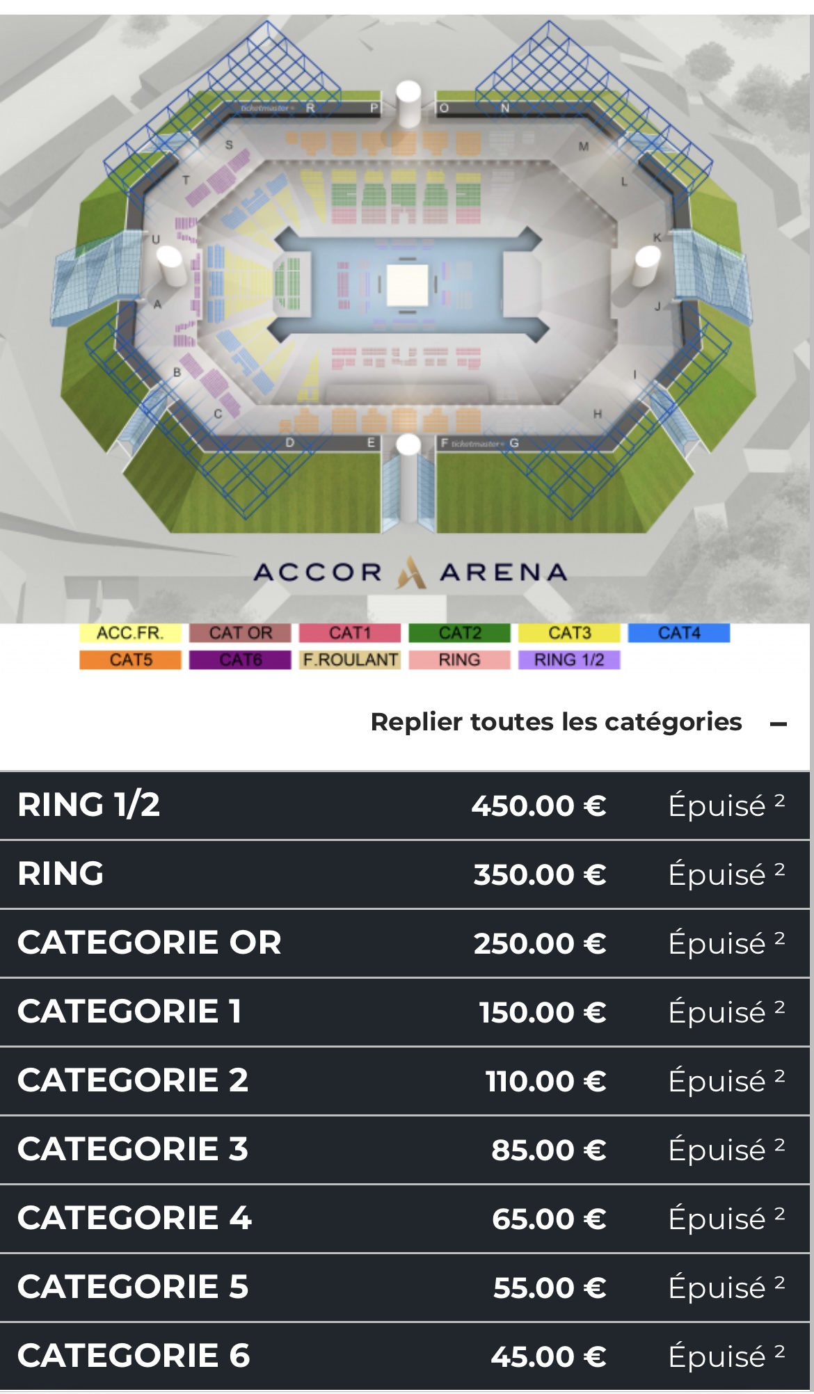 Un évènement qui a immédiatement créé de l’engouement chez les fans, au point que l’ensemble des places ont été vendues en seulement… 20 minutes. Face à une telle demande, l’Accor Arena a remis des places en ligne ce vendredi matin à 10h. Mais à l’heure actuelle, plus aucune place n’est disponible depuis la billetterie en ligne de l’Accor Arena.