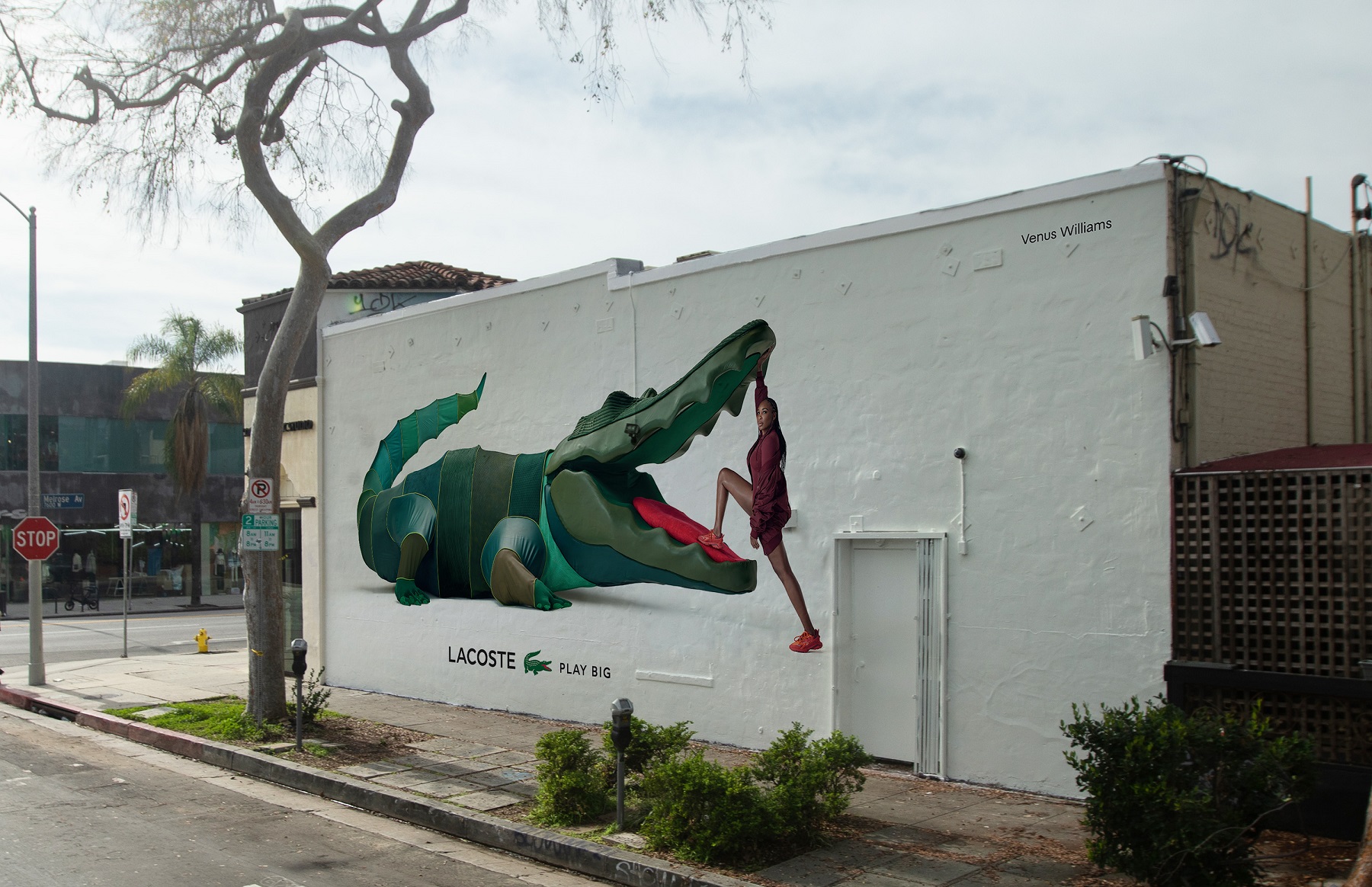 Notamment visible en affichage extérieur, la campagne de Lacoste met en avant ces 6 ambassadeurs ainsi qu’un crocodile géant (8 mètres de long et près de 3 mètres de haut) confectionné « grâce à la fusion de l’ingénierie textile, de l’artisanat et du savoir-faire ».