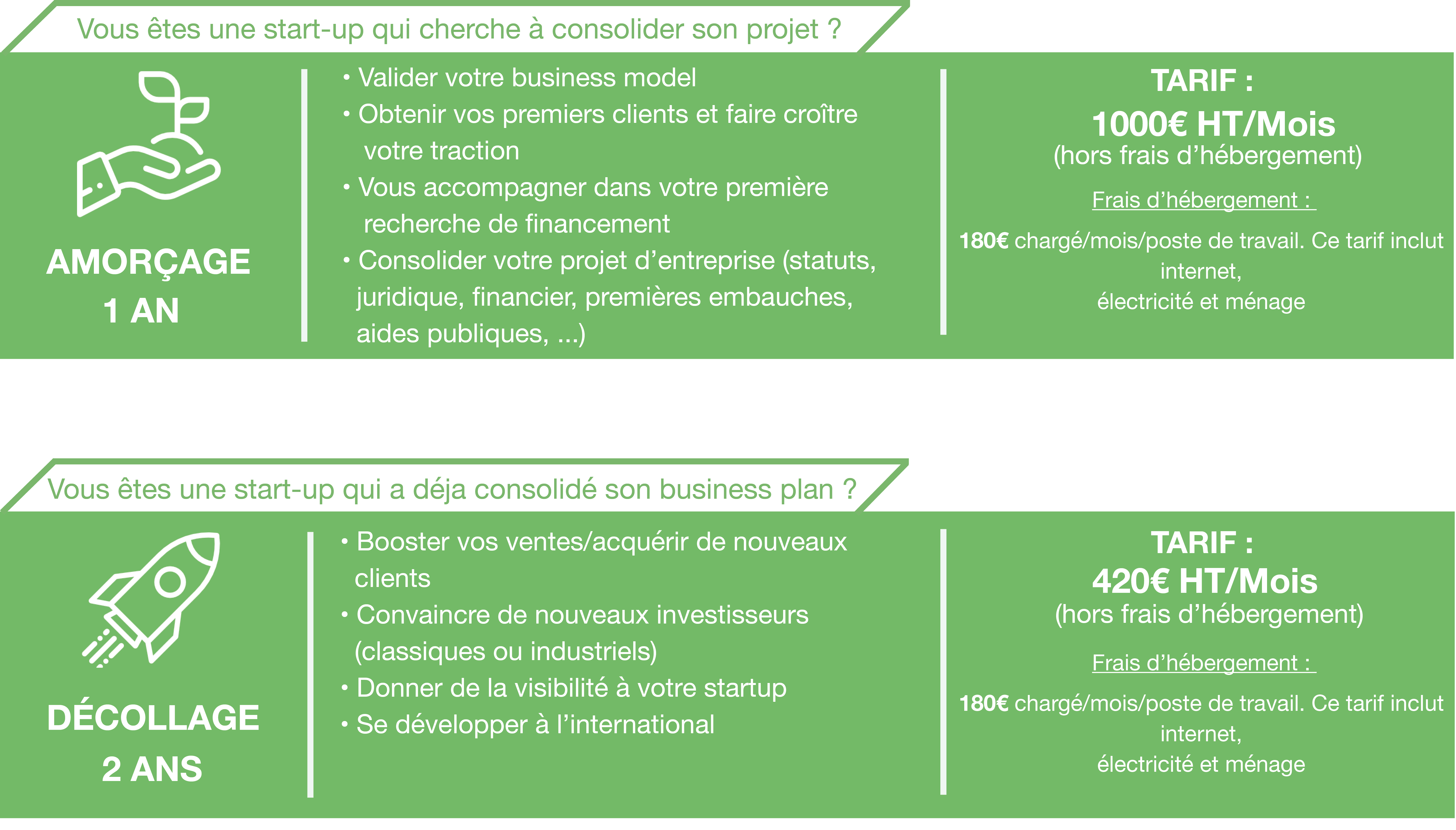Deux offres commerciales sont proposées (amorçage 1 an et décollage 2 ans) avec des tarifs allant de 1000€ HT à 420€ HT par mois hors frais d’hébergement.