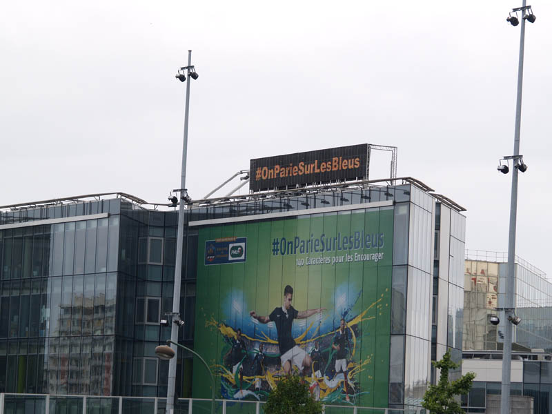 En parallèle à ce dispositif, le PMU fait également le pari des Bleus jusque sur la façade de son siège social situé dans le XVe arrondissement de Paris. Un covering aux couleurs de la campagne #OnParisSurLesBleus été installé, recouvrant ainsi les locaux du PMU. Le visuel est surmonté d’un écran LED qui fait défiler les meilleurs tweets de soutien à l’équipe de France mentionnant le Hashtag #OnParieSurLesBleus.