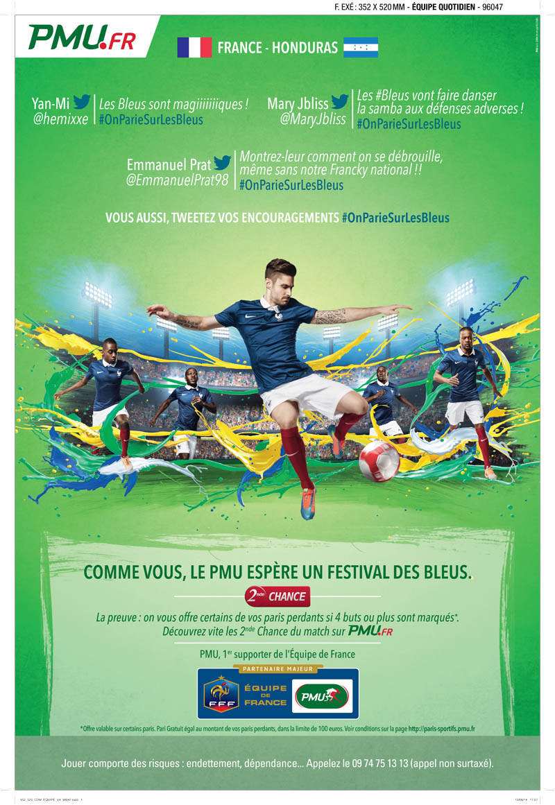 Lors de chaque journée où l’Equipe de France joue, le PMU publie dans L’Equipe un print qui met en avant certains des tweets publiés avec le hashtag #OnParieSurLesBleus. Dimanche dernier, certains twittos ont donc eu l’agréable surprise de voir leur tweet s’afficher dans le quotidien sportif via le PMU en marge du match France – Honduras. Pour être dans L’Equipe de demain au travers de la publicité du PMU à l’occasion de France – Suisse, il vous reste quelques heures pour tweeter votre message via le hashtag #OnParieSurLesBleus ! ;-)