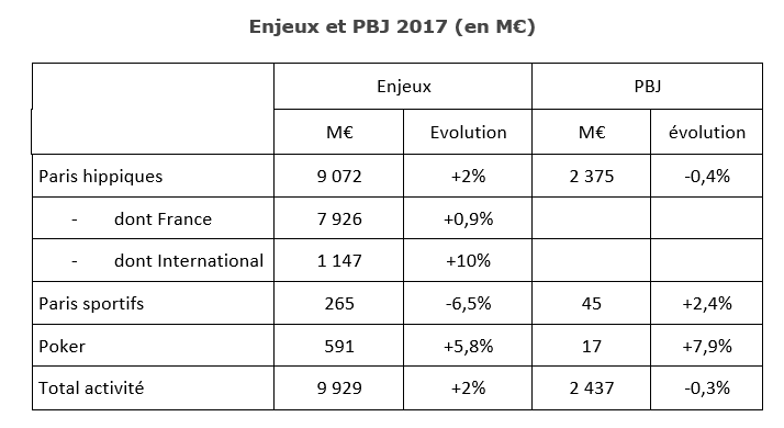 Données importantes, celles du Produit Brut des Jeux (PBJ) qui correspond à ce qu’empoche les opérateurs après redistribution aux joueurs. En 2017, le PMU a enregistré un PBJ de 2,437 milliards d’euros au global, en recul de 0,3%. Le poker et les paris sportifs ont cependant un PBJ en croissance.