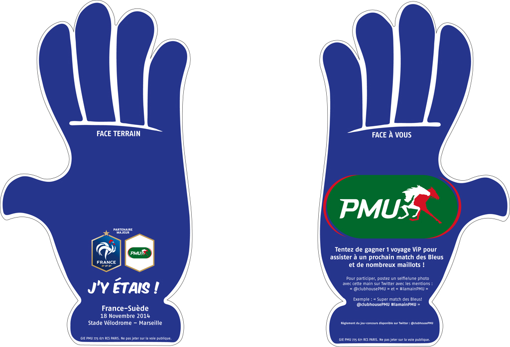 En parallèle, le PMU prolongera ce dispositif sur Twitter afin de s’offrir également une visibilité digitale. Dès demain, un jeu-concours est organisé via le compte Twitter @ClubhousePMU permettant de gagner un déplacement VIP pour assister au prochain match des Bleus dans des conditions exceptionnelles, à savoir France – Brésil ! Pour tenter sa chance, chaque spectateur devra se prendre en photo avec la Main PMU et poster celle-ci sur Twitter en mentionnant le compte @ClubhousePMU et le hashtag #lamainPMU ! Les conditions de participation sont ainsi mises en avant au verso des mains qui seront distribuées demain au Stade Vélodrome.