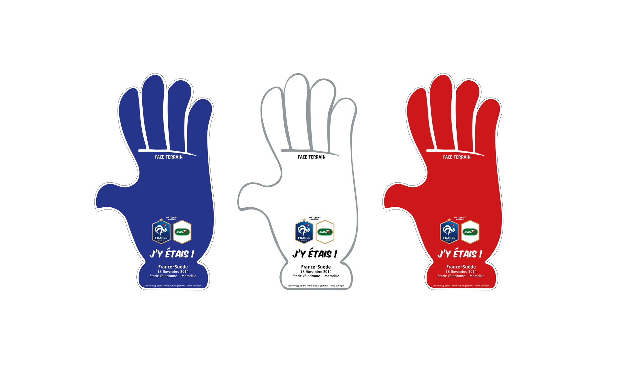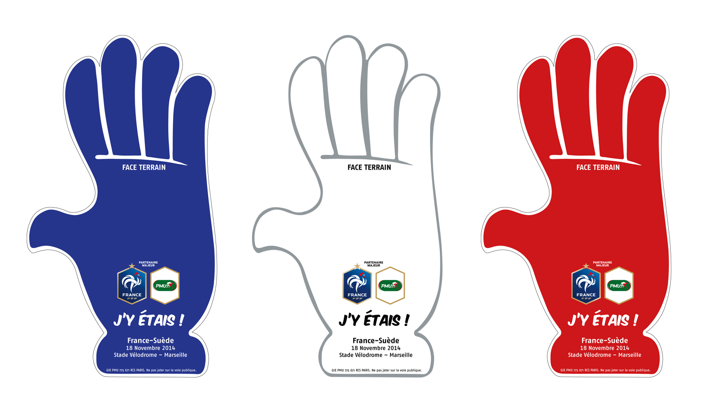 Ainsi, dès demain et à l’occasion du match France – Suède au Stade Vélodrome, les supporters situés en bas de la tribune Ganay (face caméra) seront invités à participer à un gigantesque tifo. Des milliers de mains PMU « bleu, blanc, rouge » seront ainsi distribuées pour former ce tifo aux couleurs de la France au moment de l’entrée des joueurs.
