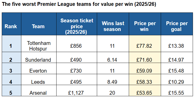 Leeds et Arsenal ferment la marche des bonnets d’âne. Ce dernier surprend : malgré 20 victoires, le club londonien impose à ses supporters le prix d’abonnement le plus élevé du championnat (1 127 £ / 1 341 €), ce qui ramène le coût par victoire à 53,65 £ (63,83 €) – bien au-delà de clubs aux résultats comparables.