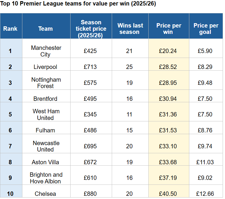 Liverpool prend la deuxième place, avec un coût de 28,52 £ (33,94 €) par victoire. Si l’abonnement s’élève à 713 £ (848 €), les Reds ont offert 25 victoires et 86 buts à leurs fans – un total de buts supérieur à tout autre club, justifiant un investissement conséquent.
