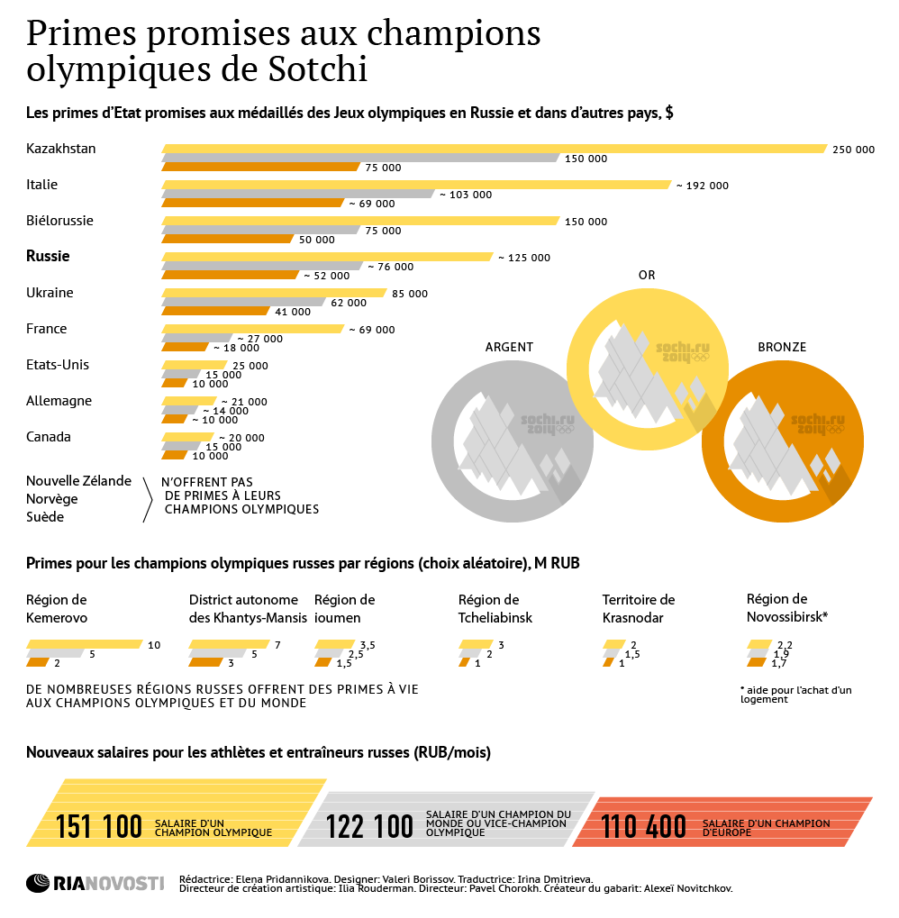 Combien touchera un athlète français en cas de médaille aux Jeux Olympiques de Sochi 2014 ? Le Ministère des sports versera 50 000€ pour une médaille d’or, 20 000€ la médaille d’argent et 13 000€ la médaille de bronze. Les primes sont donc identiques à celles des Jeux Olympiques de Londres 2012. Précisons que ces sommes ne sont pas « net d’impôts ». Sur demande du bénéficiaire, la prime peut être répartie par parts égales sur l’année en cours et les cinq années suivantes. Enfin, n’oublions pas que les meilleurs athlètes toucheront également des primes de leurs différents sponsors individuels en cas de bonne performance.