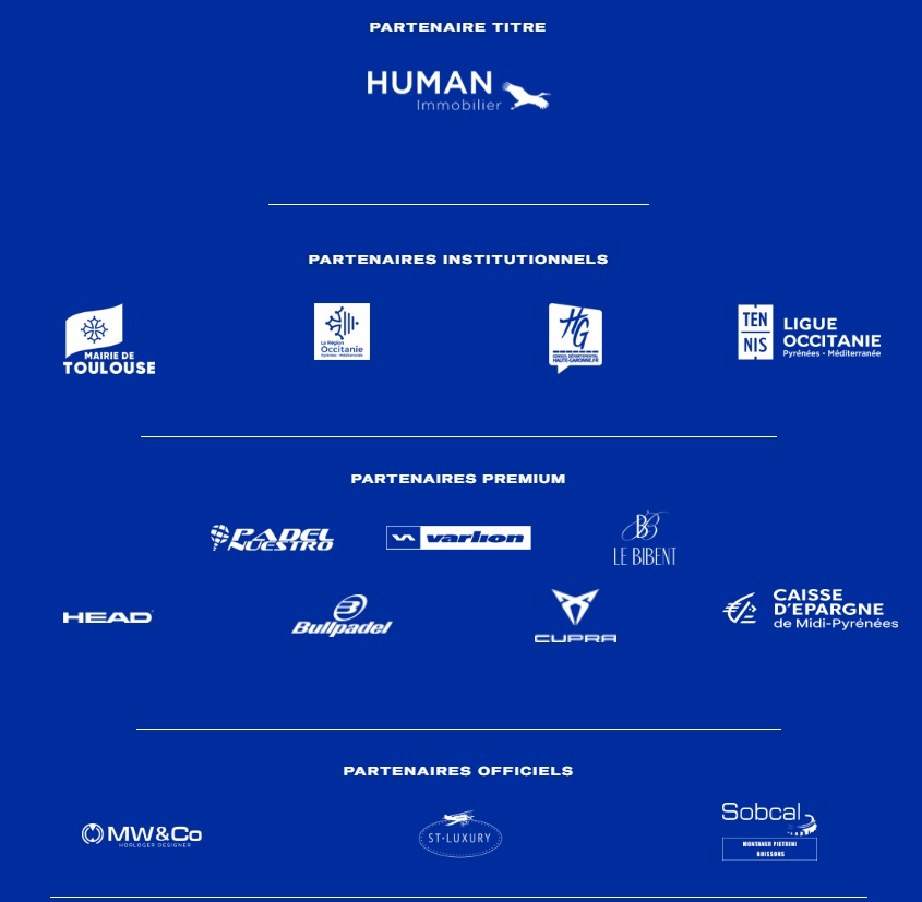 Outre le partenaire-titre (Naming) Human Immobilier, les principaux partenaires sont la Marie de Toulouse, la Région Occitanie, le Département Haute-Garonne, Padel Nuestro, Varlion, le Bibent, Head, Bullpadel, Cupra, Caisse d’Epargne Midi Pyrénées, MW&CO, ST Luxury, Sobcal, Hotel Mercure Toulouse Centre Compans, 4Padel, Sky Padel, Qpark, Nejma Parfums, DoAds, Shilton, Canal+, Toulouse FM, Padel Magazine ou encore La Dépêche.