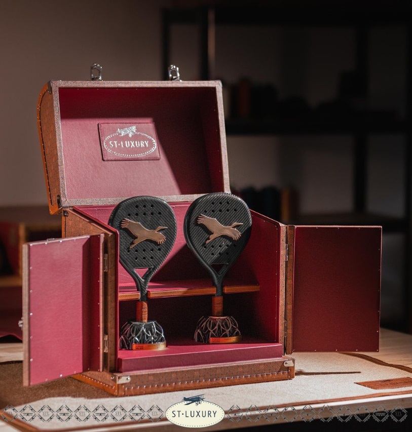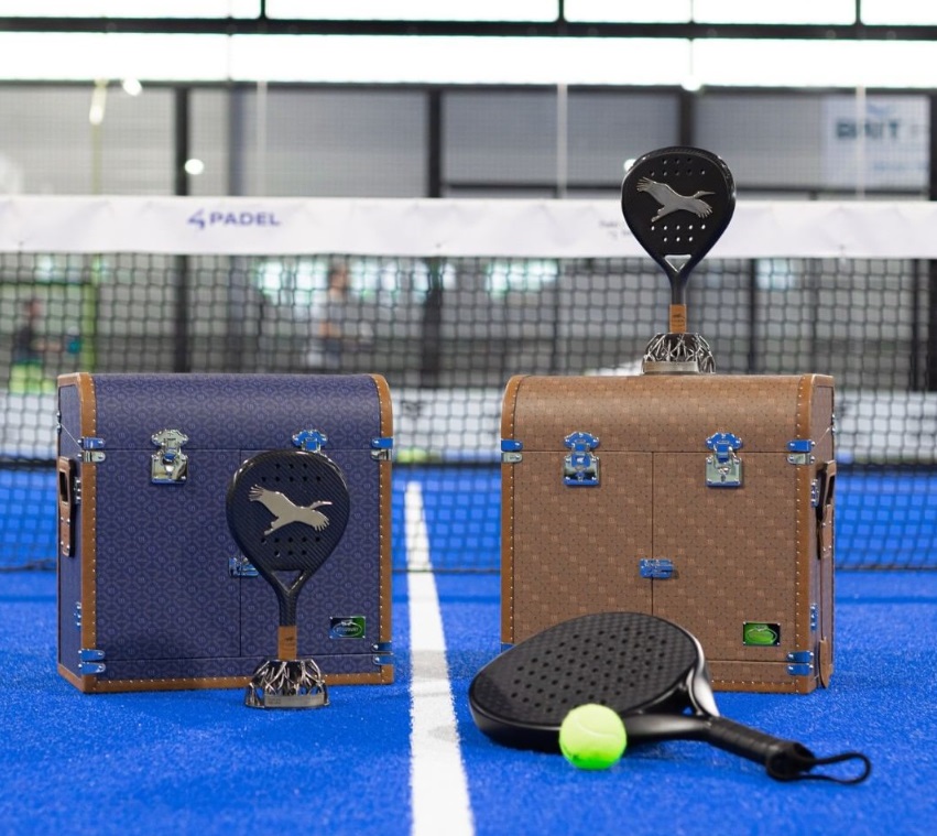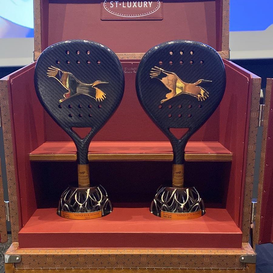 Des trophées en forme de raquettes de padel en carbone accompagnés d’un coffret rappelant ce que peut proposer Louis Vuitton et ses malles confectionnées pour les trophées des compétitions sportives les plus prestigieuses.