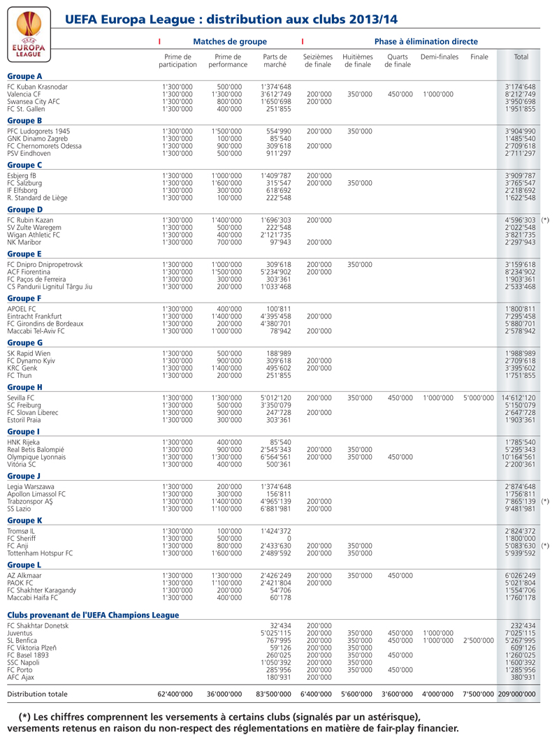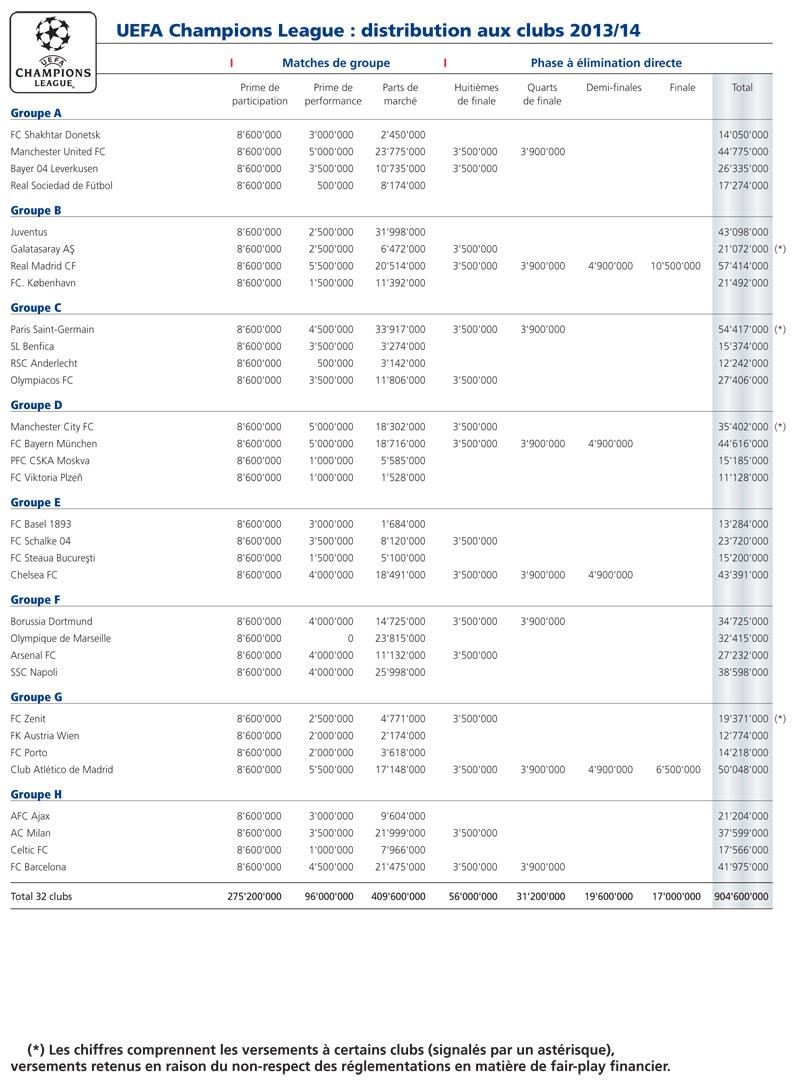 L’UEFA a également précisé que ces chiffres incluent les paiements faits à certains clubs et qui sont retenus du fait de la non-conformité avec les règles du fair-play financier. Le Parisien rapporte ainsi que le PSG devra déduire la somme de 20M€. Le PSG touchera donc en réalité 34,4M€.