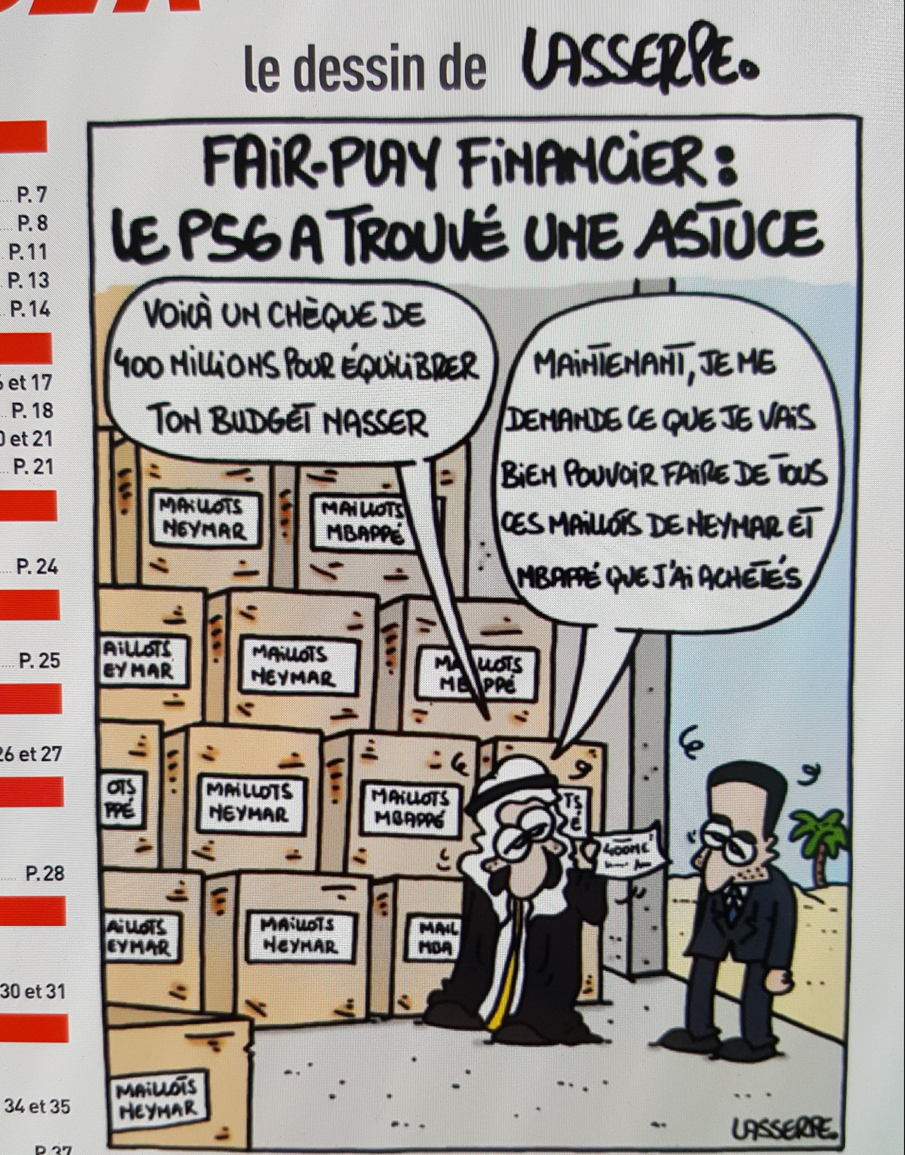 Autre solution proposée dimanche dans le quotidien L’Equipe par le dessinateur « Lasserpe », celle de voir le Qatar acheter une grosse quantité de maillots PSG floqués Neymar et Mbappé pour gonfler les recettes du club…