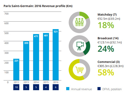 Lors de la saison 2015-2016 et selon le rapport annuel de Deloitte « Football Money League », le PSG a généré 520,9 millions d’euros de revenus (689M€ pour Manchester United) dont 58% issus du commercial (sponsoring et merchandising). Pour parvenir à un certain équilibre entre recettes et dépenses, le club parisien sera également tenté de revaloriser ses contrats sponsoring existants les plus lucratifs (équipementier Nike et sponsors maillot Emirates, QNB et Ooredoo). En parallèle, le développement de partenariats à l’international devrait s’intensifier logiquement avec la nouvelle dimension prise par le PSG.