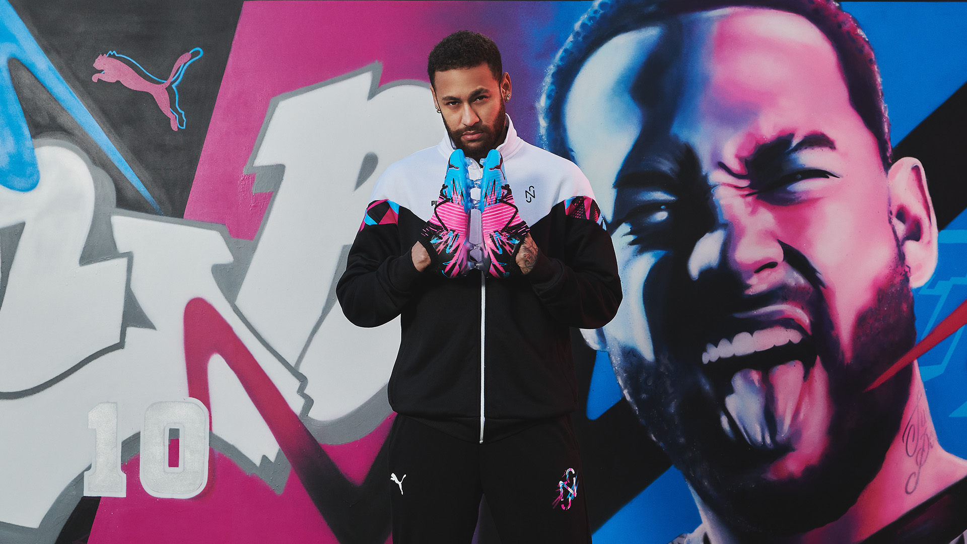 Puma a présenté ce jeudi une nouvelle collection incarnée par sa star Neymar JR. Elle comprend notamment une chaussure de football aux dominantes rose, bleu et noir.