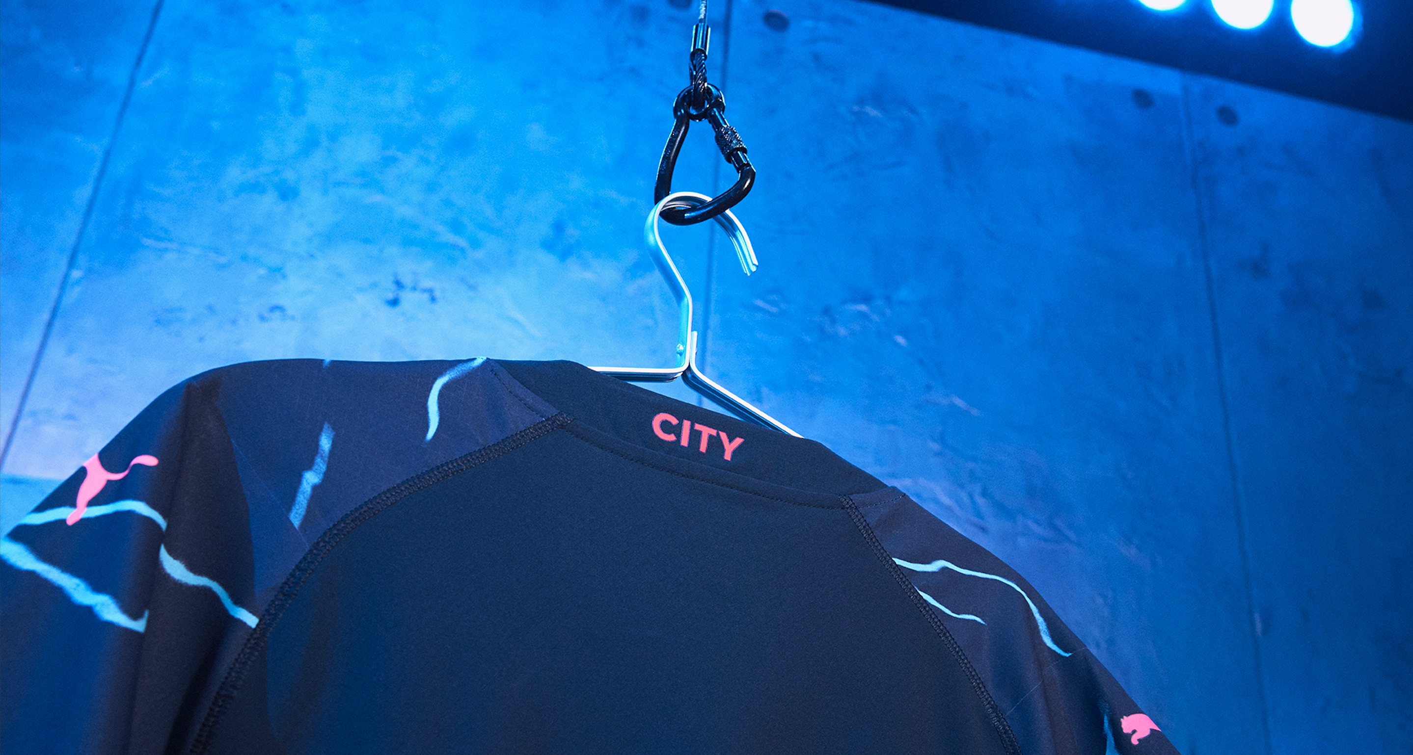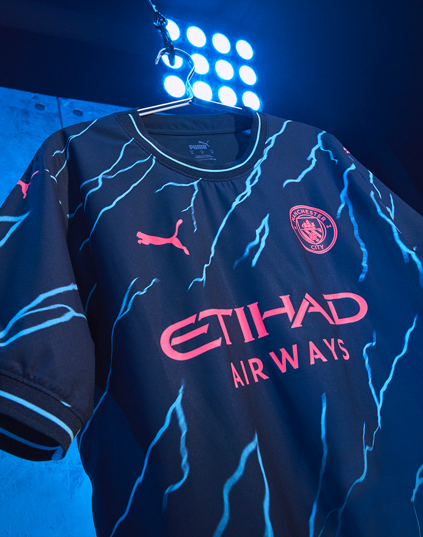 Pour la troisième tenue du club, son équipementier a choisi un style électrique. Un style pour « incarner la vie palpitante et le dynamisme de la ville de Manchester ». D’une base bleu foncé, des éclairs bleu ciel viennent traverser la tunique à plusieurs endroits. L’écusson du club, le logo puma et le sponsor maillot « Etihad Airways » sont en rose fluo.