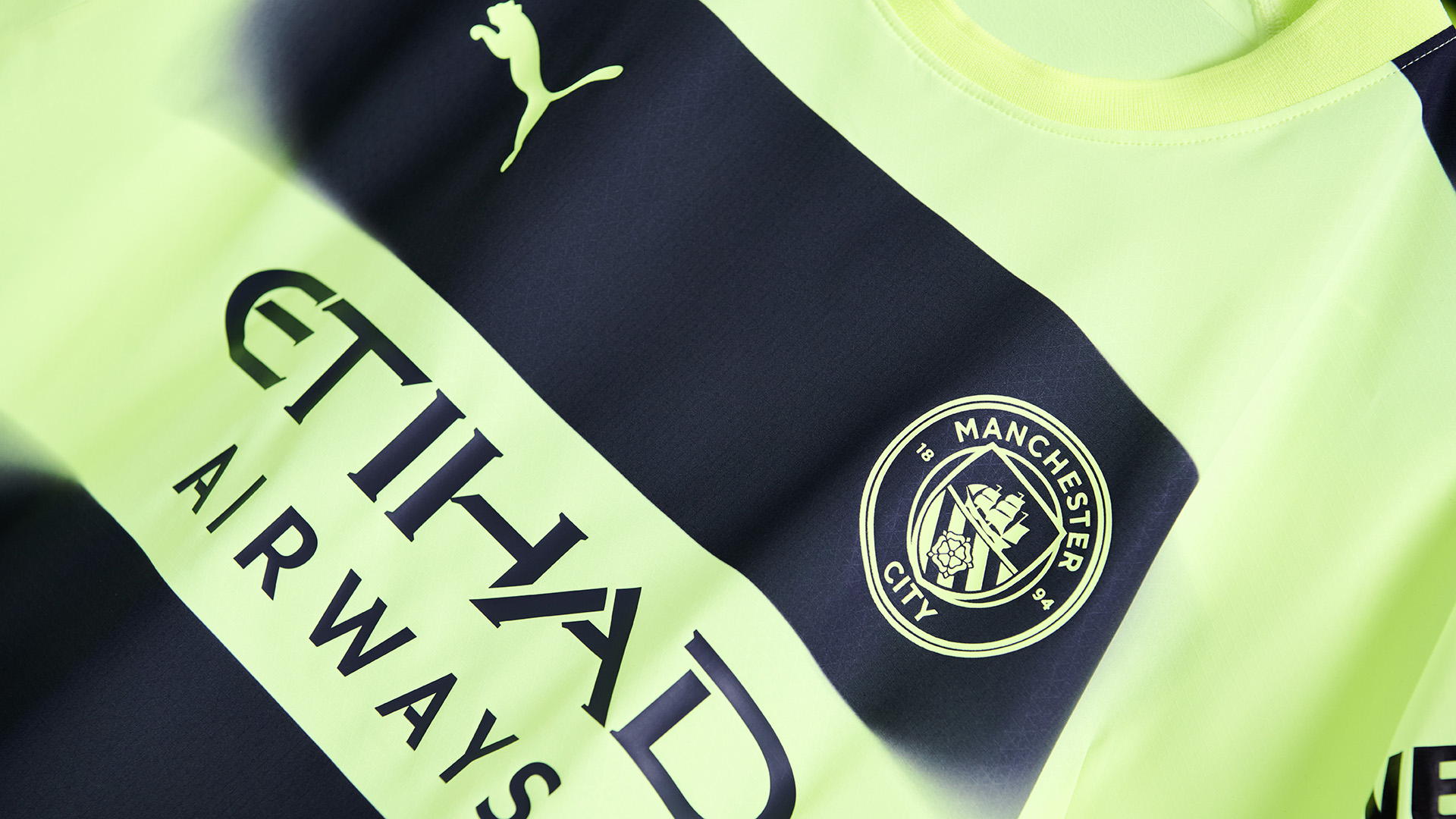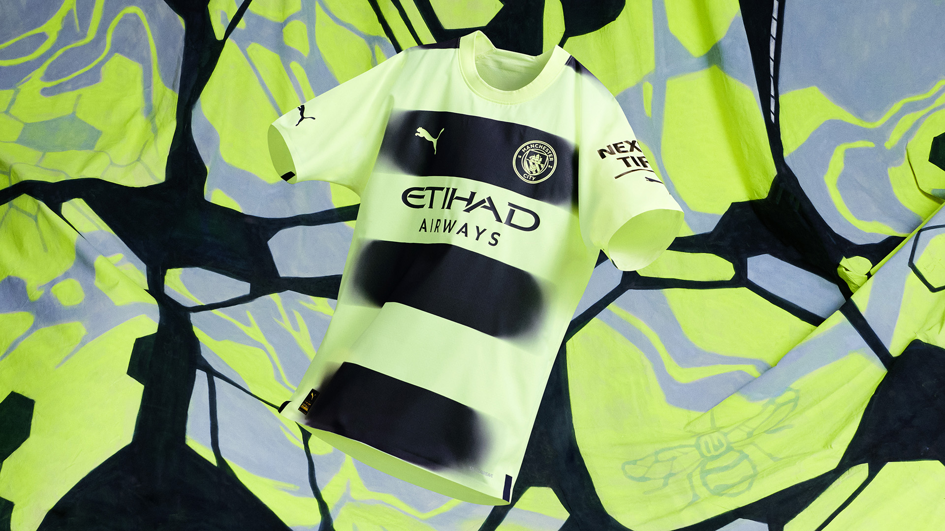 Le maillot Third vert fluo et noir de Manchester City présente « un design à cerceaux inspiré de l’abeille ouvrière de Manchester, un symbole du caractère mancunien qui trouve son origine dans les armoiries de Manchester et qui a très vite envahi les rues, les murs et les galeries de la ville. Pour la touche finale, les cerceaux sont recouverts d’un effet spécial de peinture à la bombe qui rend hommage à la créativité et à l’art synonymes de Manchester ».