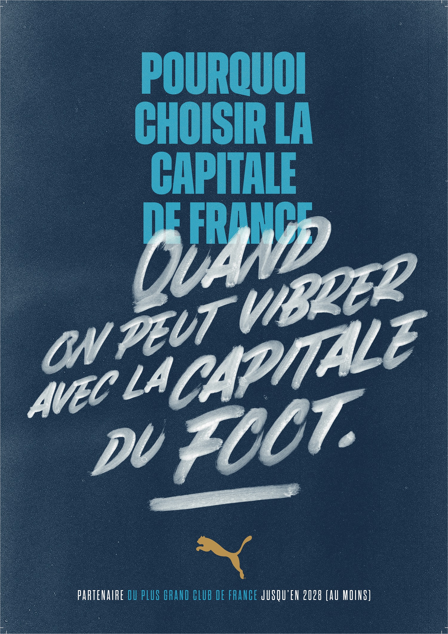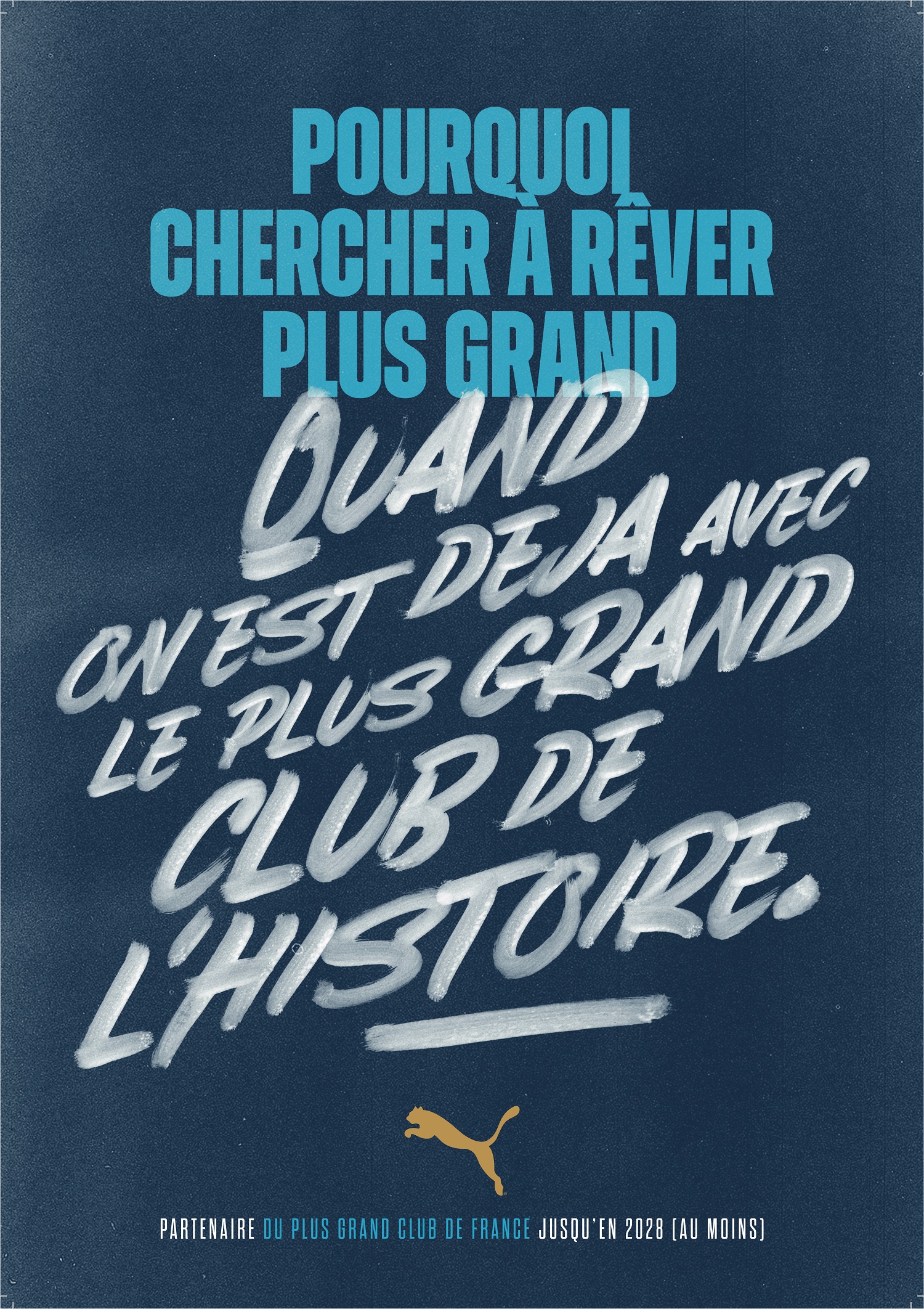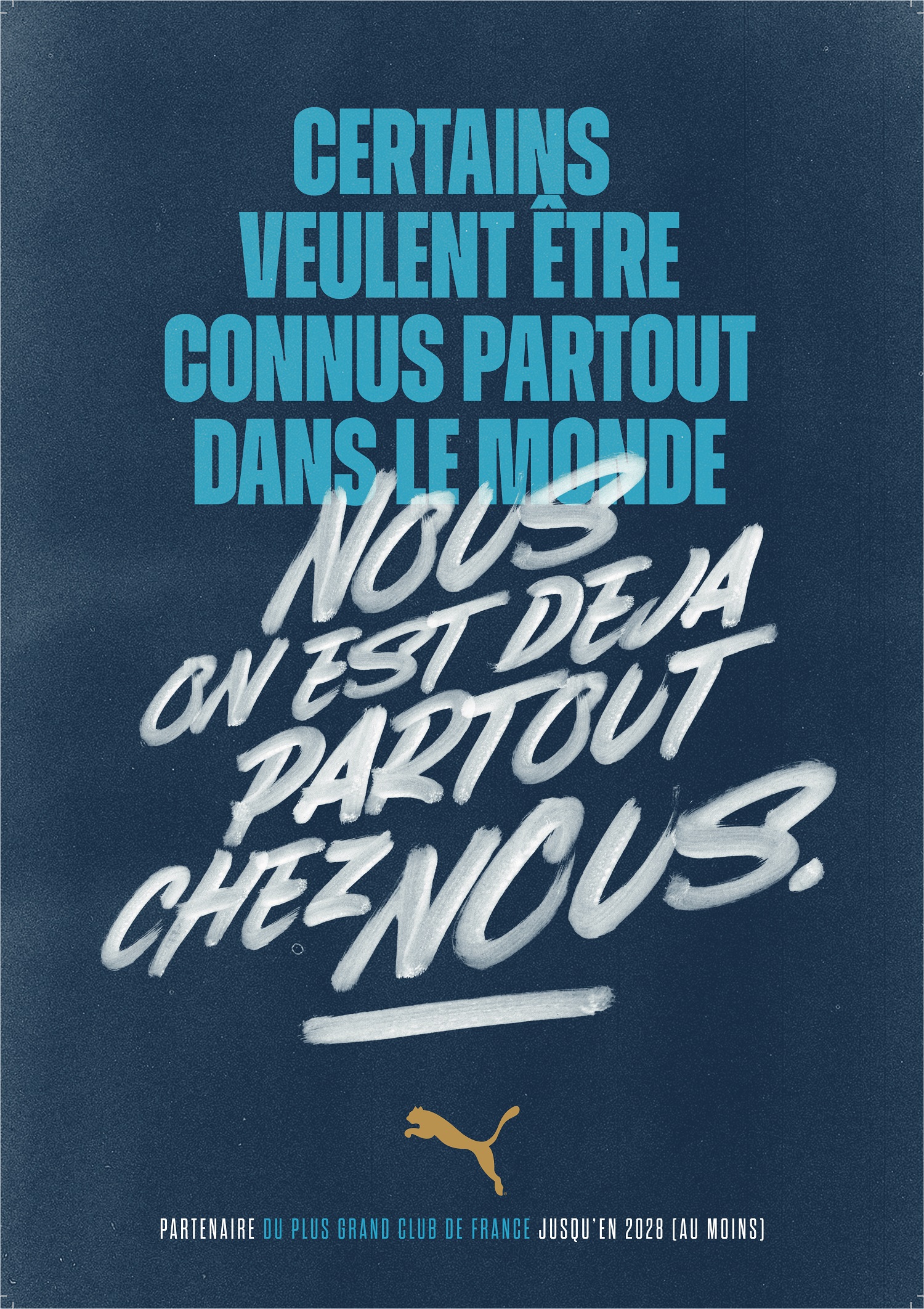 Pour célébrer ce renouvellement, l’équipementier a décidé de lancer une campagne d’affichage « sauvage » dans les rues de Marseille, comme cela avait été le cas en 2017 pour « teaser » l’arrivée de la marque aux côtés de l’OM. L’occasion pour Puma de faire quelques références au club rival du Paris Saint-Germain. Sur l’une des affiches, on peut notamment lire « pourquoi chercher à rêver plus grand quand on est déjà avec le plus grand club de l’histoire ». Sur les affiches, l’équipementier se positionne comme le partenaire du plus grand club de France jusqu’en 2028 (au moins).