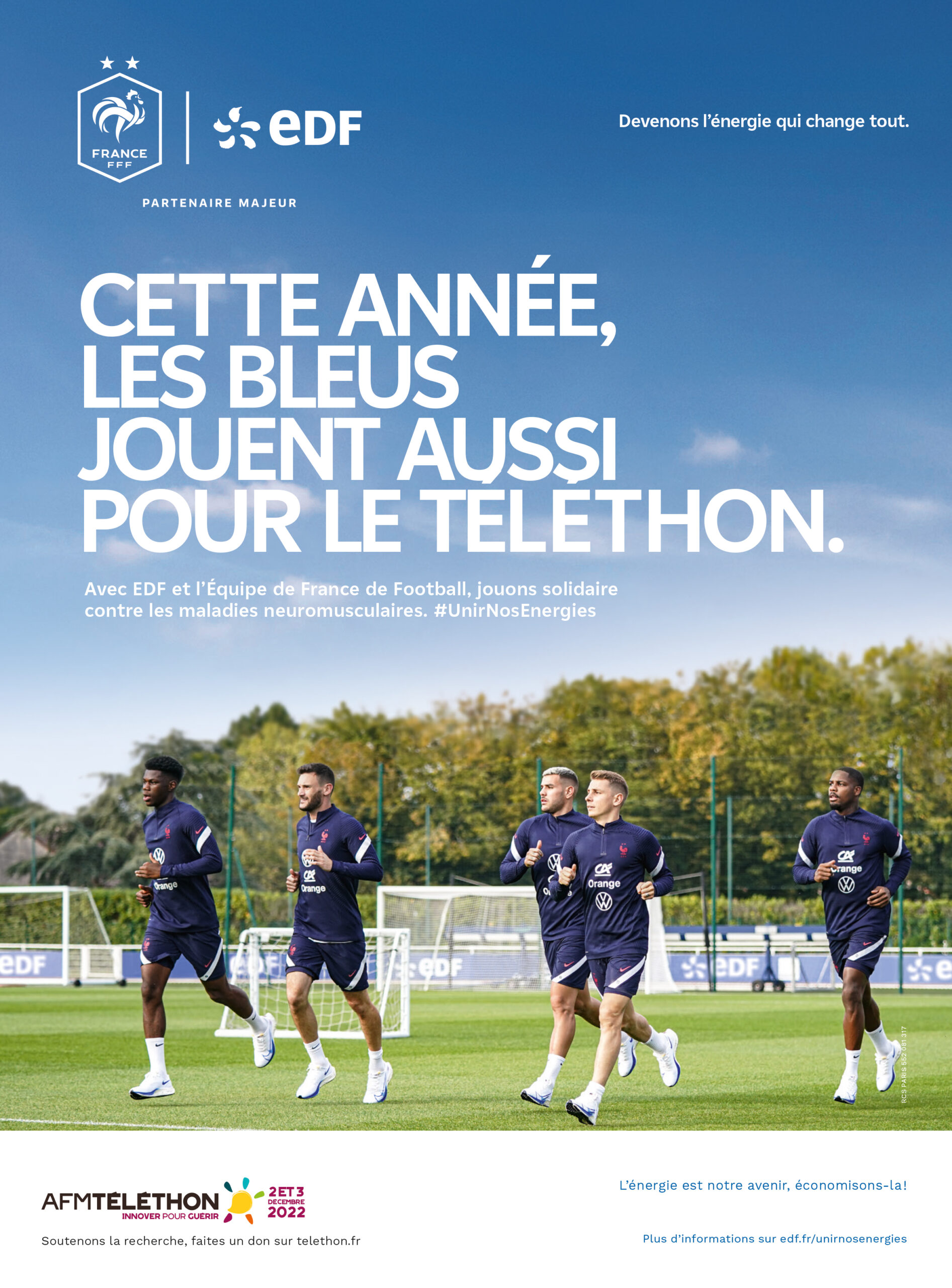 Durant la Coupe du Monde, EDF prend la parole autour des Bleus au profit de l’AFM-Téléthon. En télévision, EDF diffuse un spot publicitaire avec les joueurs de l’Equipe de France expliquant que chaque but, passe, arrêt et tir des joueurs, mais aussi chaque tweet avec le #UnirNosÉnergies déclencheront un don d’EDF à l’AFM Téléthon.