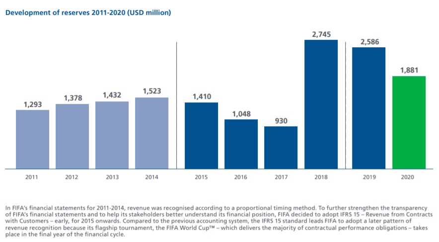 Au 31 décembre 2020, les réserves de la FIFA s’élèvent ainsi à 1,881 milliard de dollars, soit une baisse de 27% par rapport à 2019. Une baisse qui s’explique notamment par le plan d’aide de la FIFA contre le Covid-19 et les investissements de l’instance dans ses différents programmes de développement. 1,5 milliard de dollars ont été prélevés sur les réserves afin de soutenir les 211 associations membres et les six confédérations.