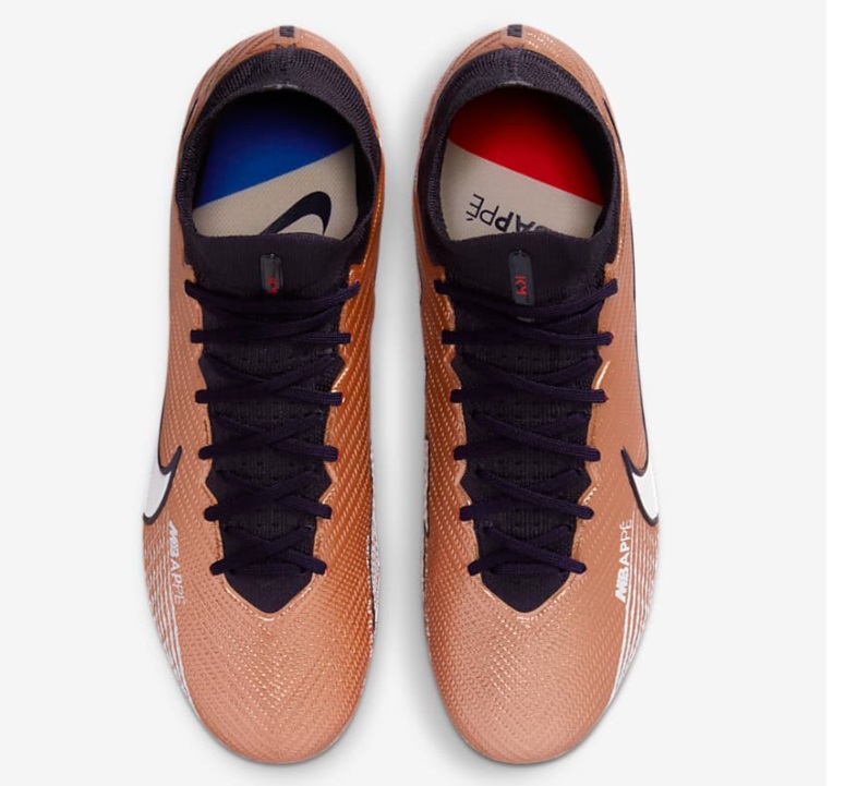 Sur la collection (coloris cuivre) spécifique pour la Coupe du Monde Qatar 2022, la marque au swoosh apporte une petite touche personnalisée sur les chaussures Mercurial de l’attaquant des Bleus.