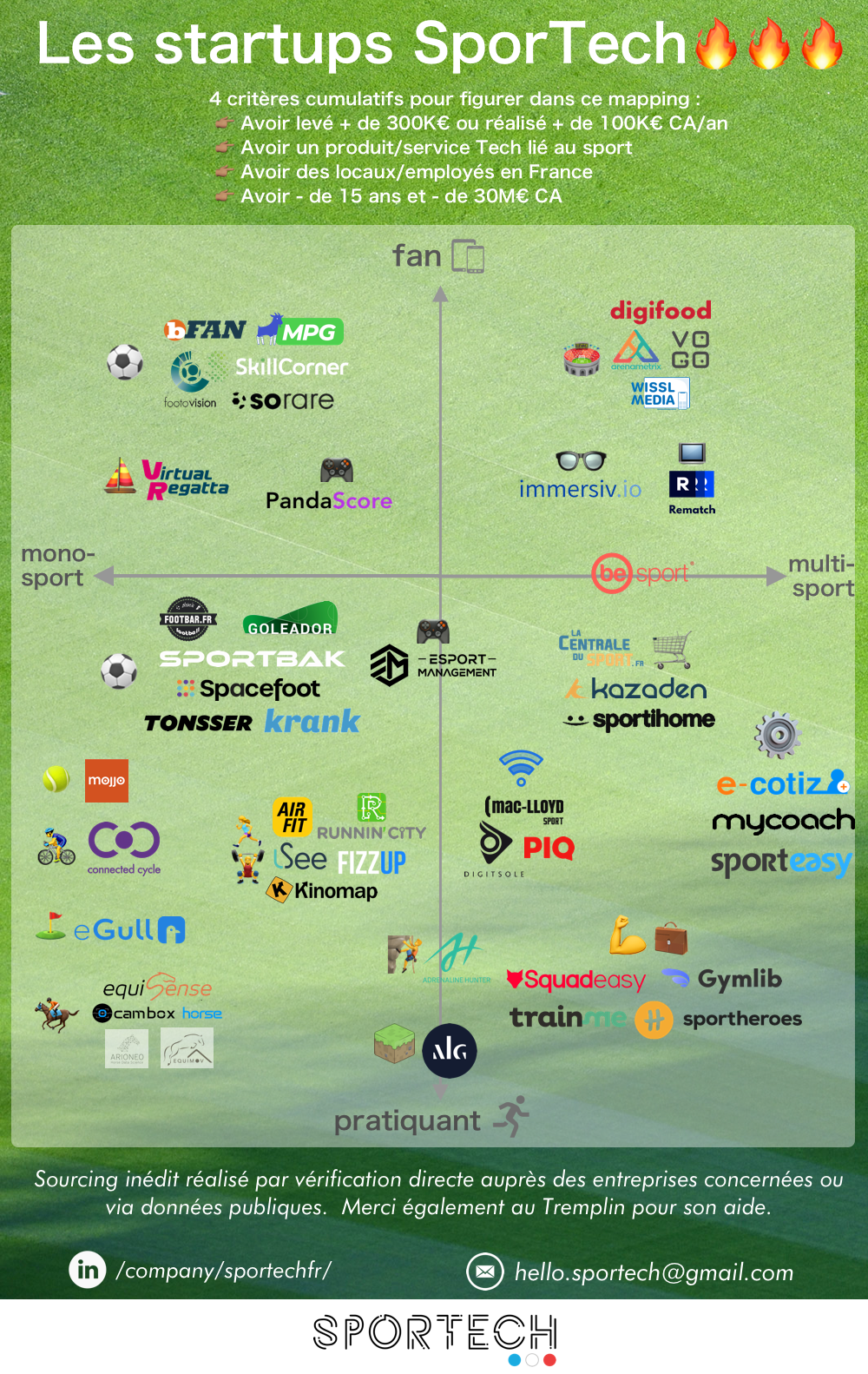 Pour accompagner le lancement de ce collectif, #SporTech publie une cartographie des 50 sociétés (voir la liste plus bas) en les triant par activité (orienté fan ou sportif / mono sport ou multisport). En parallèle, un manifesto rappelant quelques données montrant l’importance du secteur sportif a également été publié.