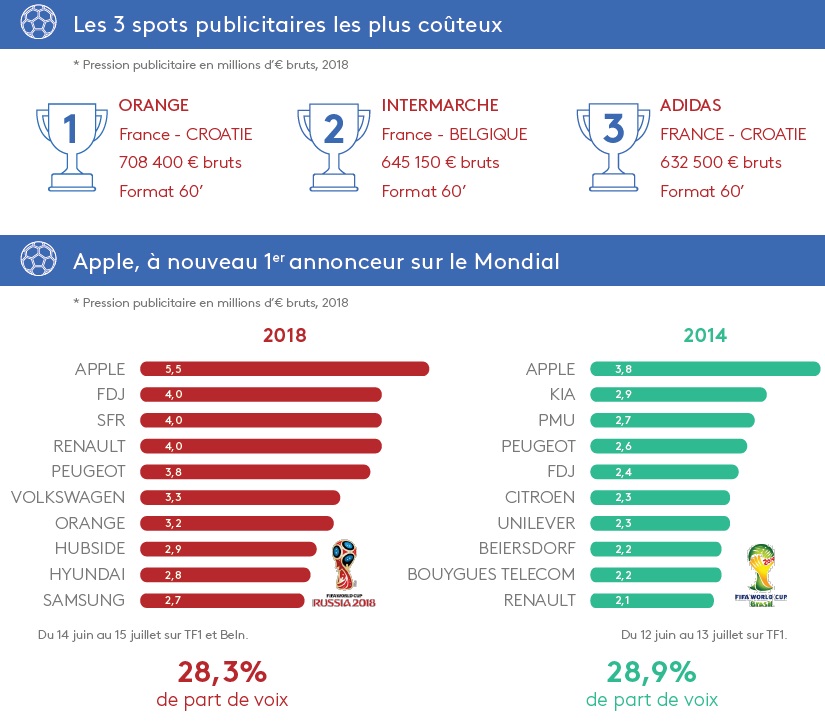 Parmi les 10 annonceurs les plus présents dans les publicités de la Coupe du Monde 2018, on retrouve Apple, FDJ, SFR, Renault, Peugeot, Volkswagen, Orange, Hubside, Hyundai et Samsung. Kantar Media estime ainsi à 5,5 millions d’euros le prix des espaces pubs occupés par Apple qui est, comme pour 2014, le 1er annonceur du mondial.