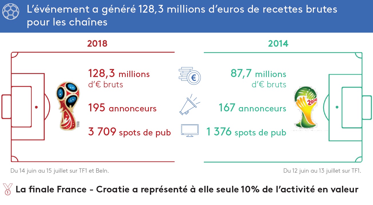 Selon la société d’études, la Coupe du Monde 2018 a généré 128,3 millions d’euros de recettes brutes pour TF1 et beIN SPORTS. En réalité, les recettes seront plus élevés car l’estimation de Kantar Media ne prend en compte que les espaces publicitaires avant, pendant et après la retransmission des matchs et ne prend pas en compte les parrainages et autres dépenses sur les supports digitaux des deux chaînes et autres packs.