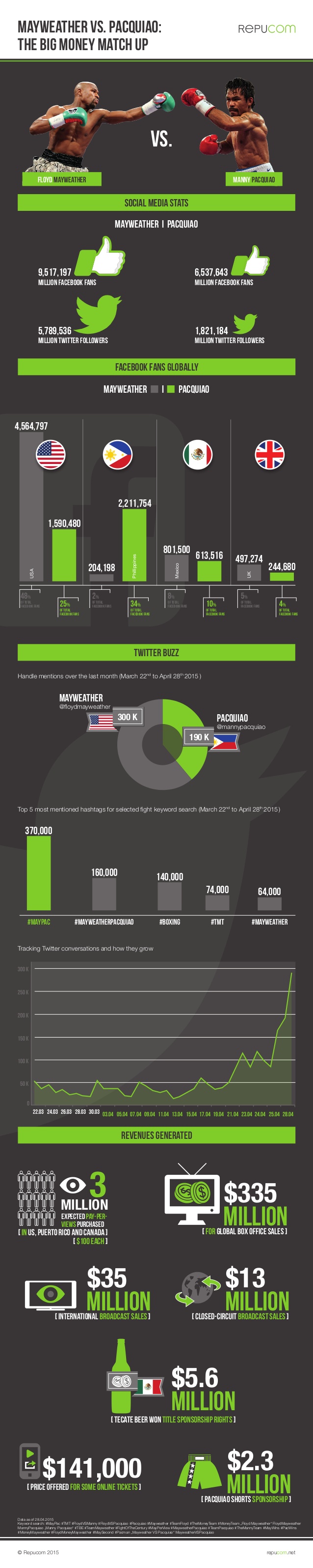 A deux jours du combat de boxe du siècle entre Floyd Mayweather et Manny Pacquiao qui se dispute samedi soir au MGM Grand de Las Vegas (diffusion dimanche très tôt sur Ma Chaîne Sport qui a déboursé environ 250 000€ selon L’Equipe du jour), Repucom a réuni quelques chiffres business et social media sur une infographie.