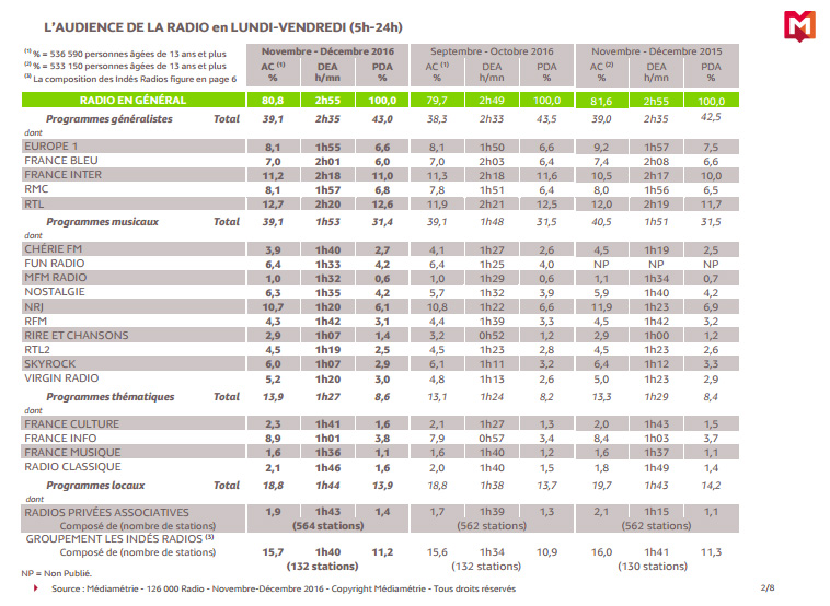 Les audiences radio novembre-décembre 2016 (lundi au vendredi)