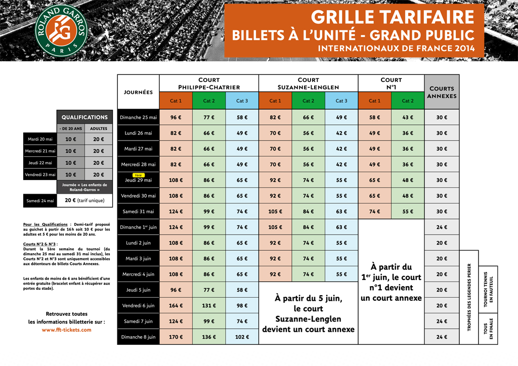 Le tarif pour assister aux qualifications (20-23 mai) et à la journée des enfants (24 mai) est de 20 euros. Pour rentrer dans les travées de Roland Garros dès le dimanche 25 mai et assister aux premiers tours sur les annexes, il vous faudra débourser 30 euros. Pour assister à la finale Hommes qui se disputera le dimanche 8 juin 2014 si la météo le permet, il vous faudra débourser 170 euros en catégorie 1.