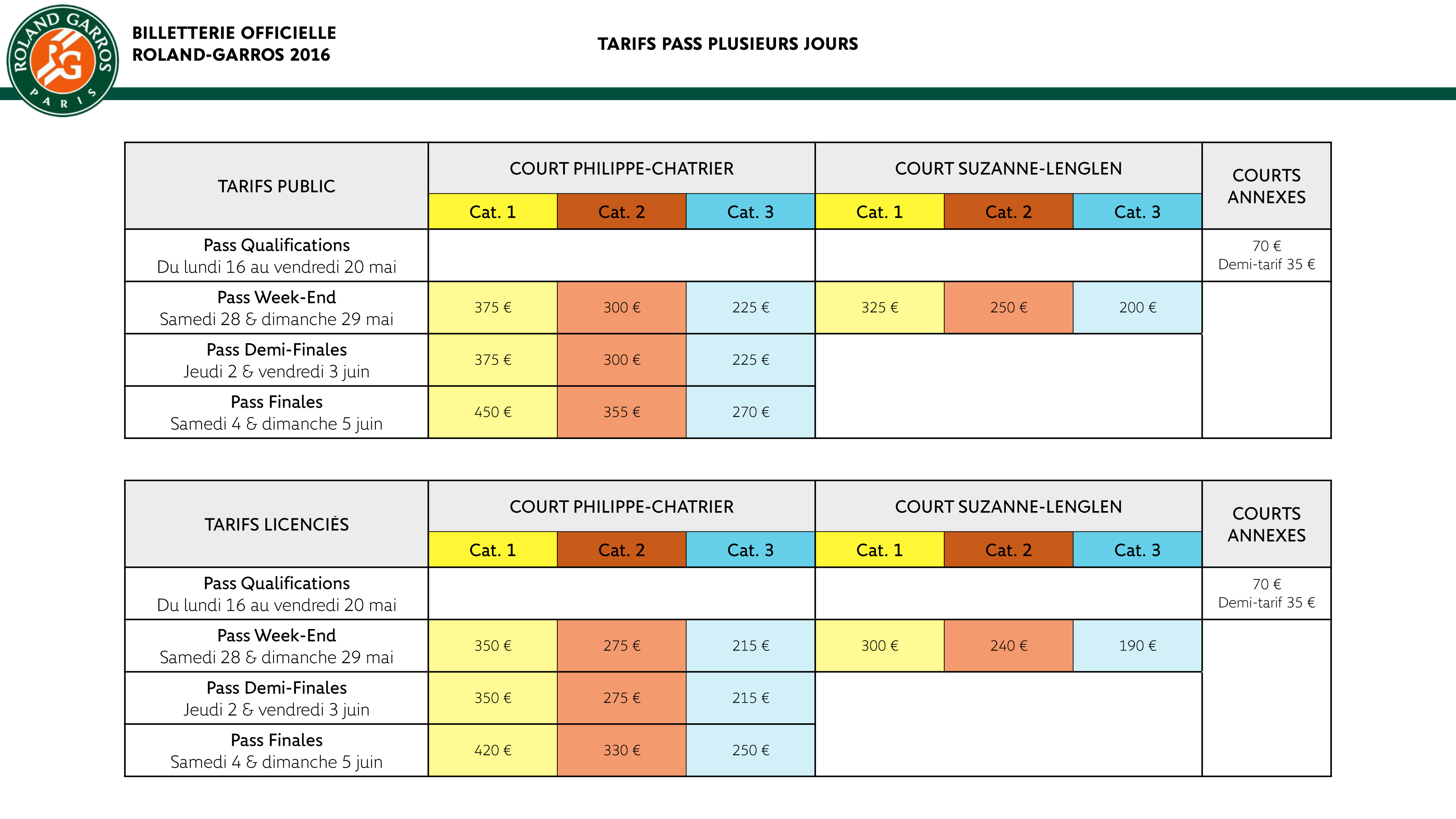 Pour celles et ceux qui souhaitent profiter de Roland-Garros sur deux jours consécutifs, il est possible de vous procurer des billets « pass ». Pour voir les deux finales, comptez entre 270€ (catégorie 3) et 450€ (catégorie 1) au tarif grand public. 2 jours de tennis sur le Suzanne-Lenglen le week-end du 28-29 mais vous coûtera entre 200€ et 325€.