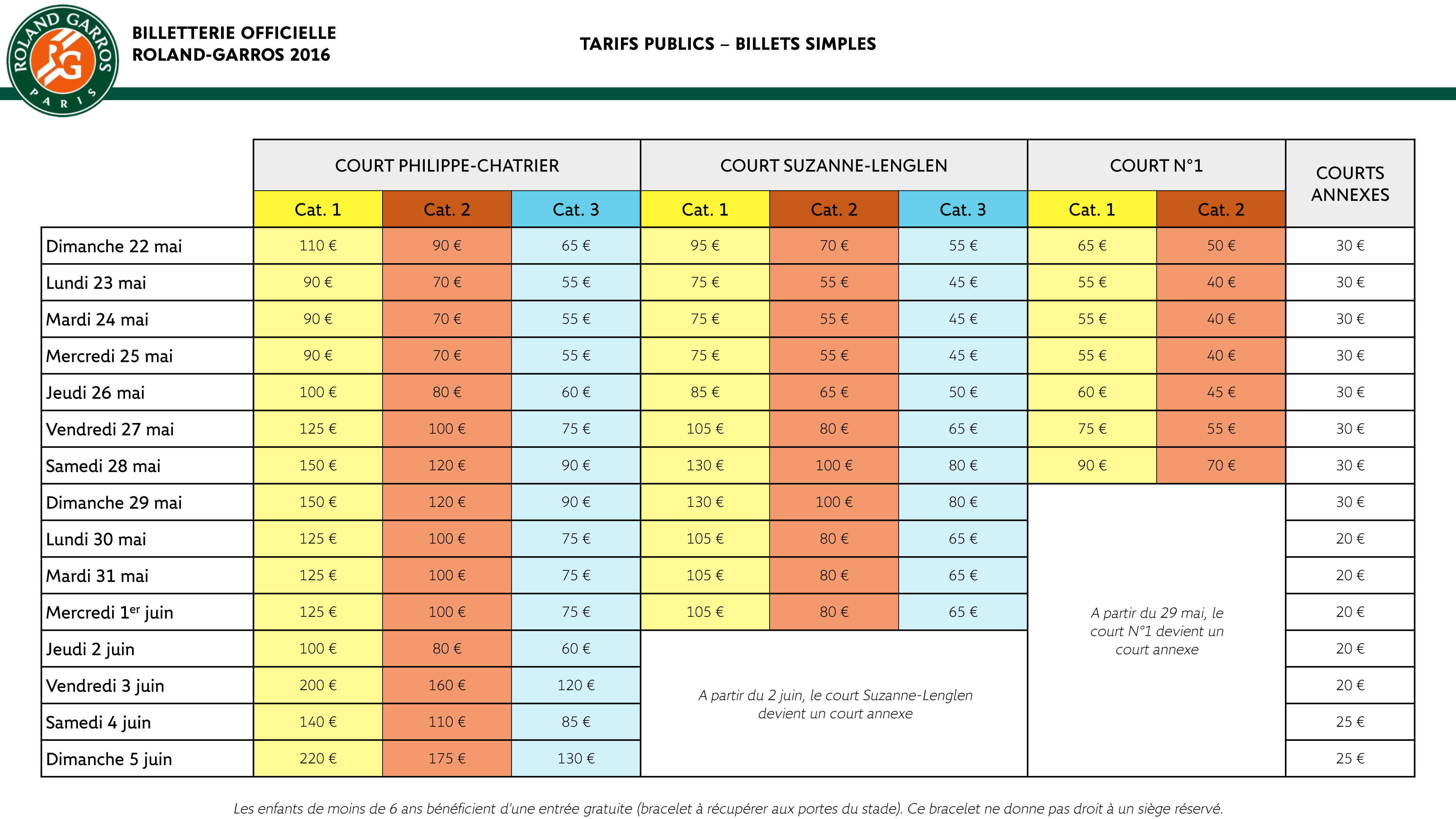 Le billet le plus cher de Roland-Garros 2016 sera vendu 220 euros pour une place en catégorie 1 sur le court Philippe-Chatrier le dimanche 5 juin 2016 pour la finale du simple hommes. Pour ce match, le billet le moins cher sera vendu 130€ (catégorie 3). Pour la finale Dames du samedi 4 juin 2016, comptez entre 85€ et 140€. Pendant la quinzaine, le prix d’une place sur le Suzanne-Lenglen variera de 45€ à 130€.