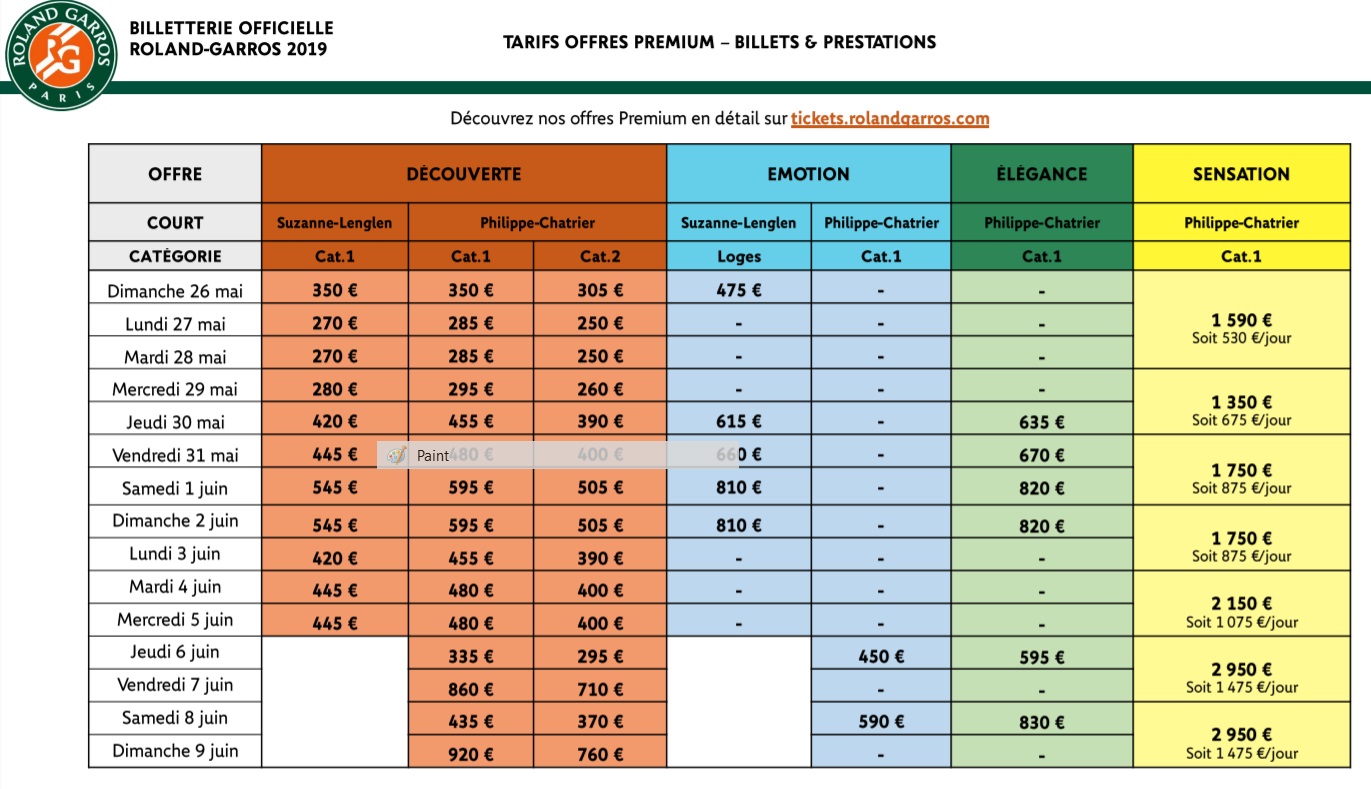En parallèle à la billetterie sèche Grand Public, la FFT propose également des packs Premium avec prestations + places en vente à partir du 6 mars 2019. Avec le pack sensation, vous pouvez vous offrir les 2 finales Dames et Messieurs pour 2950€, soit 1475€ le match.