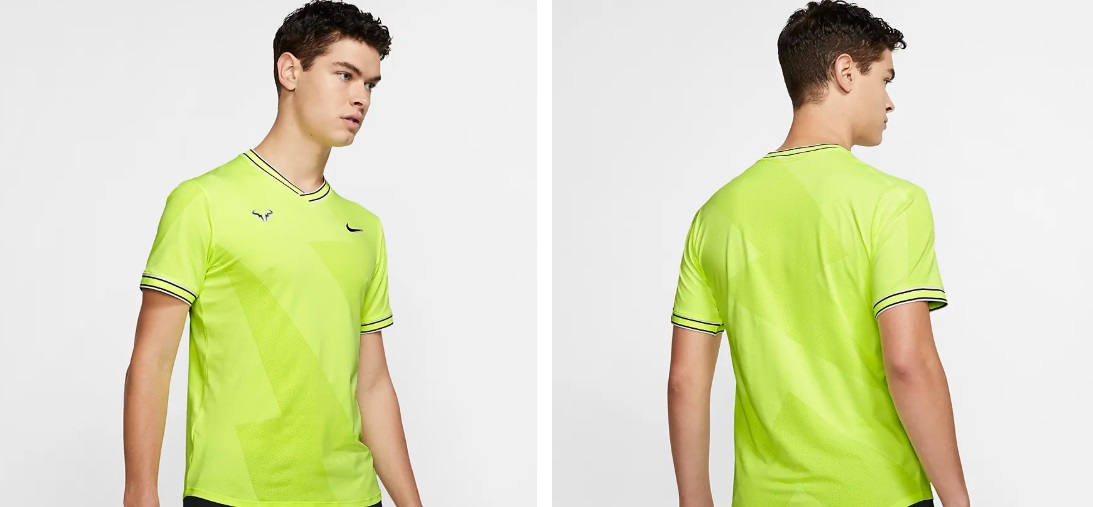 Pour accompagner ses chaussures « patchwork », Rafael Nadal portera un haut Nike jaune fluo phosphorescent « AeroReact ». Un t-shirt floqué du logo de l’espagnol en vente sur le site de Nike au prix de 75€. Comptez 65 euros pour le short gris NikeCourt Flex Rafa Ace.