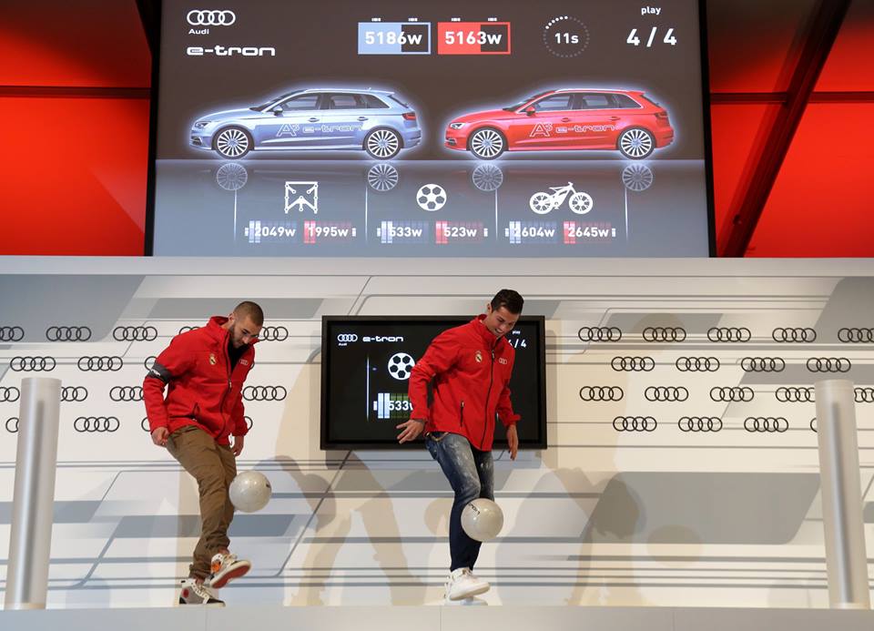Hier, les joueurs du Real Madrid ont reçu leurs nouvelles AUDI, sponsor du club. Comme les joueurs du FC Barcelone quelques jours plus tôt, Benzema, Ronaldo, Bale et leurs coéquipiers ont participé à quelques exercices physiques pour produire de l’énergie et charger une A3 Sportback e-tron électrique. Pour l’occasion, Ronaldo et Benzema se sont défiés dans un concours de jongles.